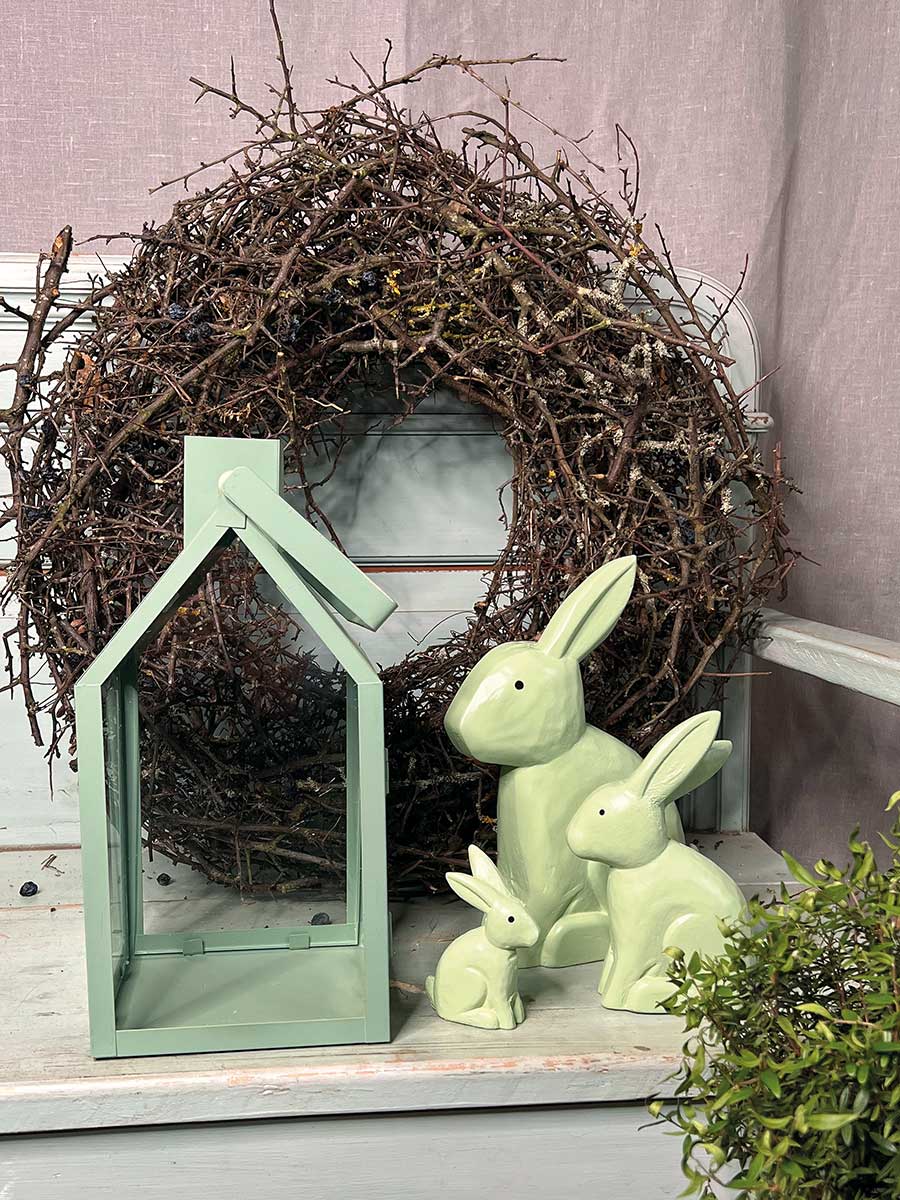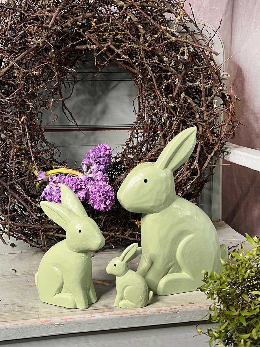 Bemalter hellgrüner Holzhase Rabbit in Schnitzoptik, tolle Osterdekoration. Besonders hübsch wirkt der Hase in Kombination mit den anderen Größen und Formen