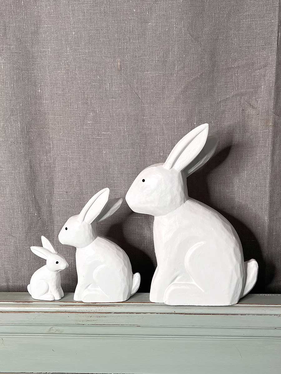 Bemalter weißer Holzhase Rabbit in Schnitzoptik, tolle Osterdekoration. Besonders hübsch wirkt der Hase in Kombination mit den anderen Größen und Formen