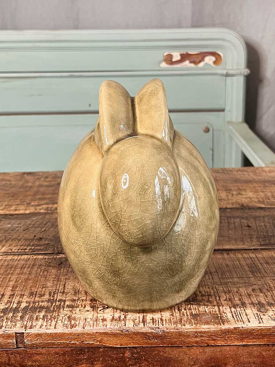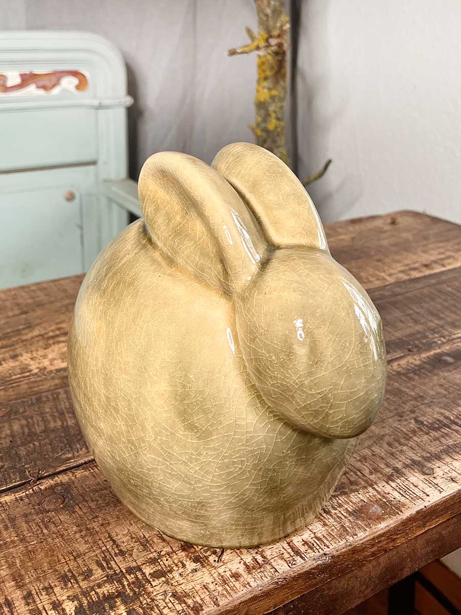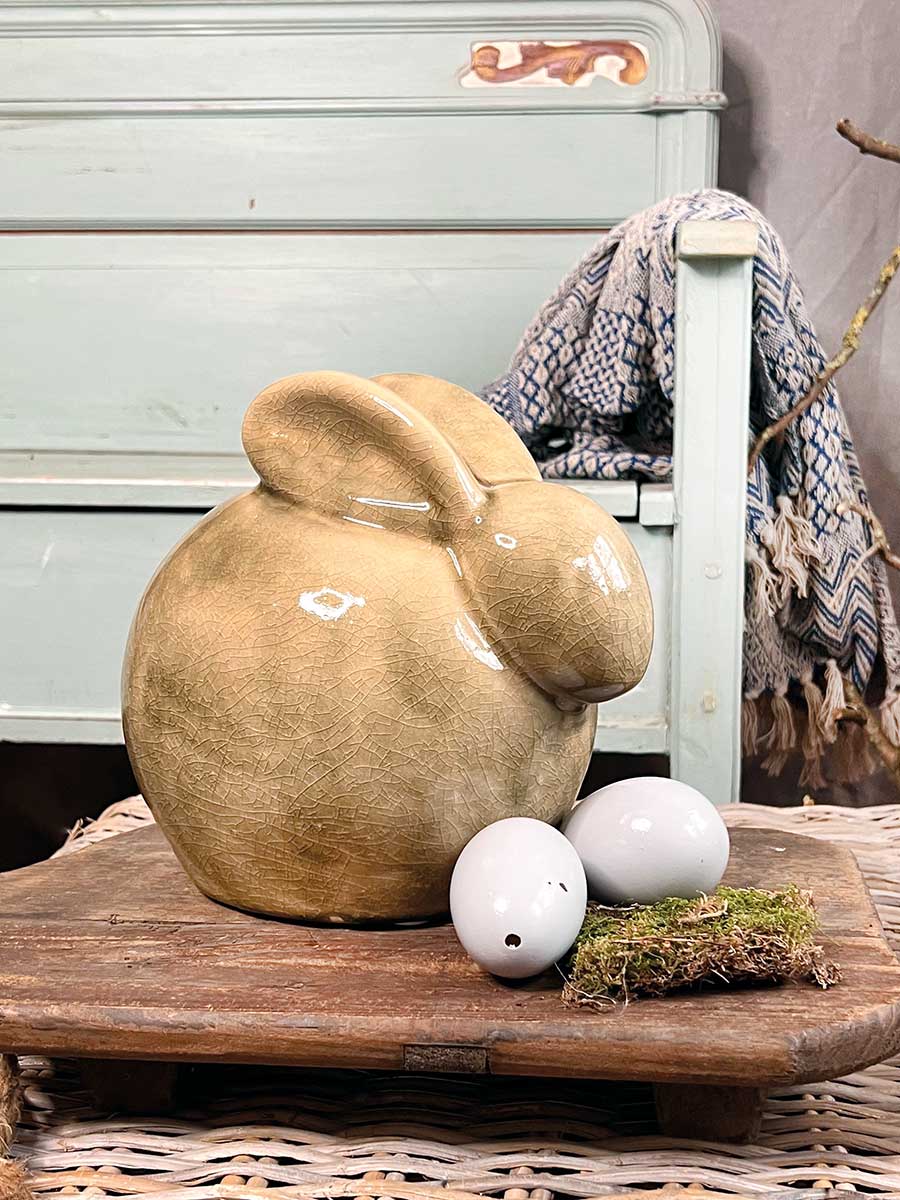 Keramik Osterhase "Levi" in geduckter Haltung von Vosteen. Hübsche Landhausdekoration mit feinem netzartigen Rissdesign (Krakelee), innen hohl.