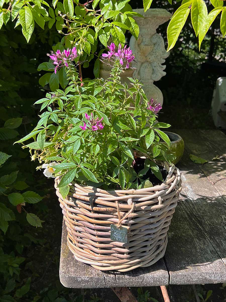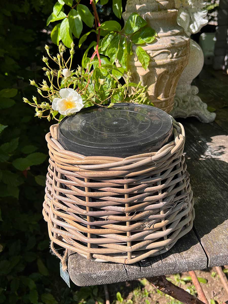 Rustikaler runder Pflanzkorb aus Rattan mit Kunststoffeinsatz. Der unverwüstliche Pflanzkorb ist einfach unverzichtbar für die mobile Terrassenbepflanzung, er trotzt Wind und Wetter, freut sich im Winter jedoch über einen geschützten Standort. Zum Ablaufen von überschüssigem Gießwasser kleine Löcher in den Einsatz bohren. Besonders schön in Kombination mit mehreren Körben. Durch die Verarbeitung eines natürlichen Werkstoffes fällt jeder Pflanzkorb ein wenig anders aus.