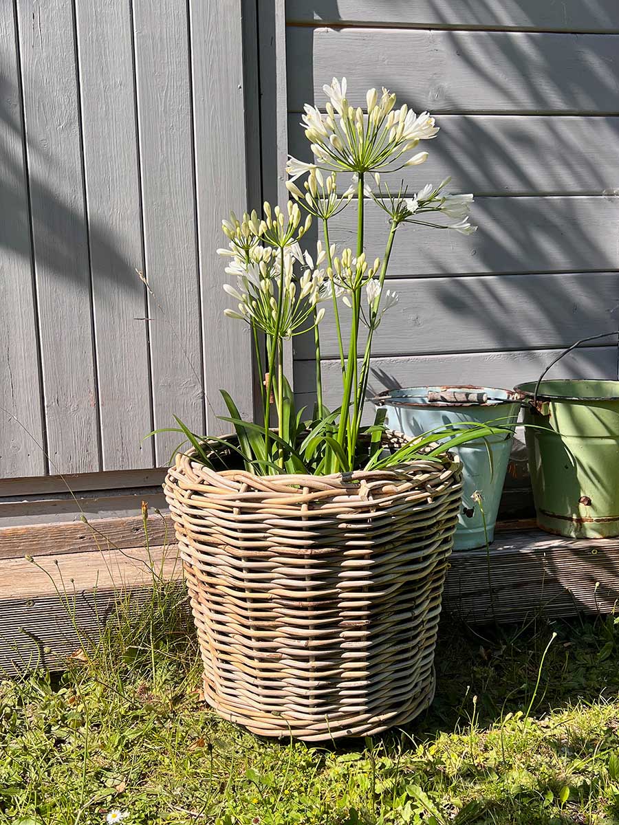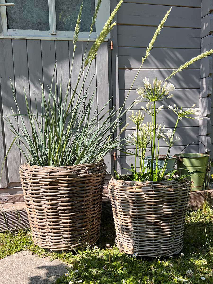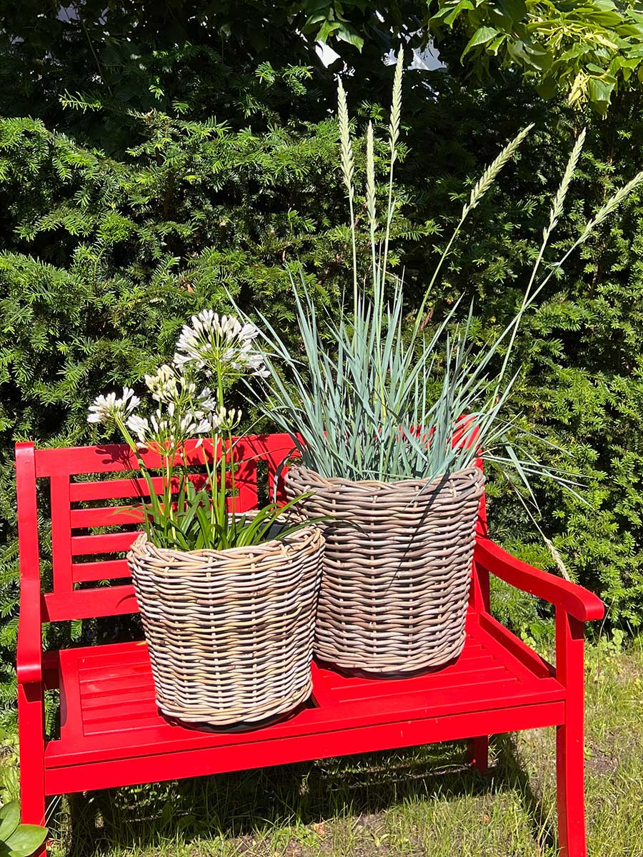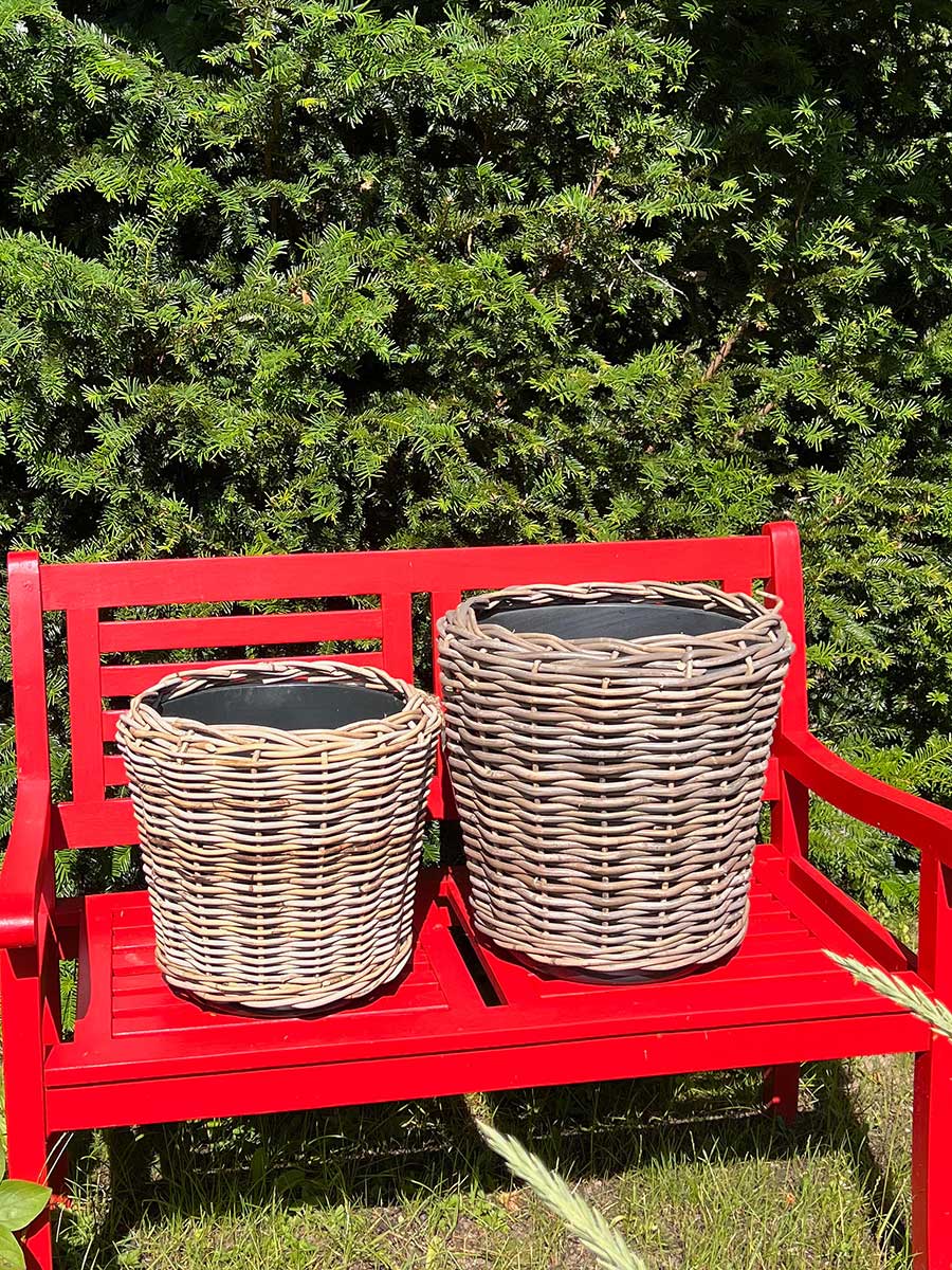 Rustikaler runder Pflanzkorb aus Rattan mit Kunststoffeinsatz. Der unverwüstliche Pflanzkorb ist einfach unverzichtbar für die mobile Terrassenbepflanzung, er trotzt Wind und Wetter, freut sich im Winter jedoch über einen geschützten Standort. Zum Ablaufen von überschüssigem Gießwasser kleine Löcher in den Einsatz bohren. Besonders schön in Kombination mit mehreren Körben. Durch die Verarbeitung eines natürlichen Werkstoffes fällt jeder Pflanzkorb ein wenig anders aus.