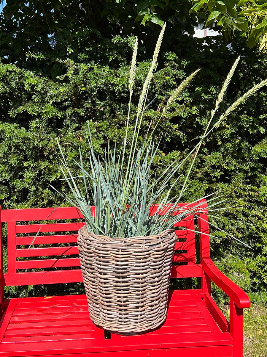 Rustikaler runder Pflanzkorb aus Rattan mit Kunststoffeinsatz. Der unverwüstliche Pflanzkorb ist einfach unverzichtbar für die mobile Terrassenbepflanzung, er trotzt Wind und Wetter, freut sich im Winter jedoch über einen geschützten Standort. Zum Ablaufen von überschüssigem Gießwasser kleine Löcher in den Einsatz bohren. Besonders schön in Kombination mit mehreren Körben. Durch die Verarbeitung eines natürlichen Werkstoffes fällt jeder Pflanzkorb ein wenig anders aus.