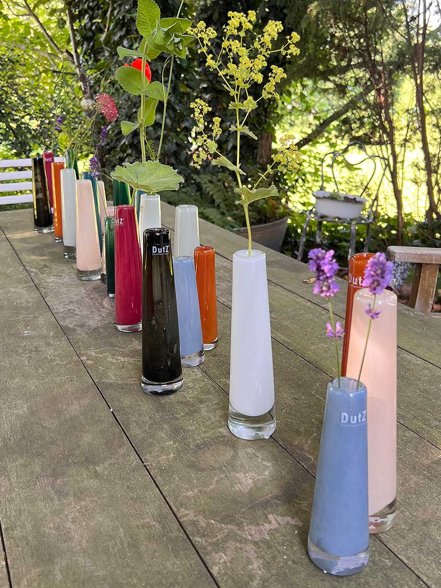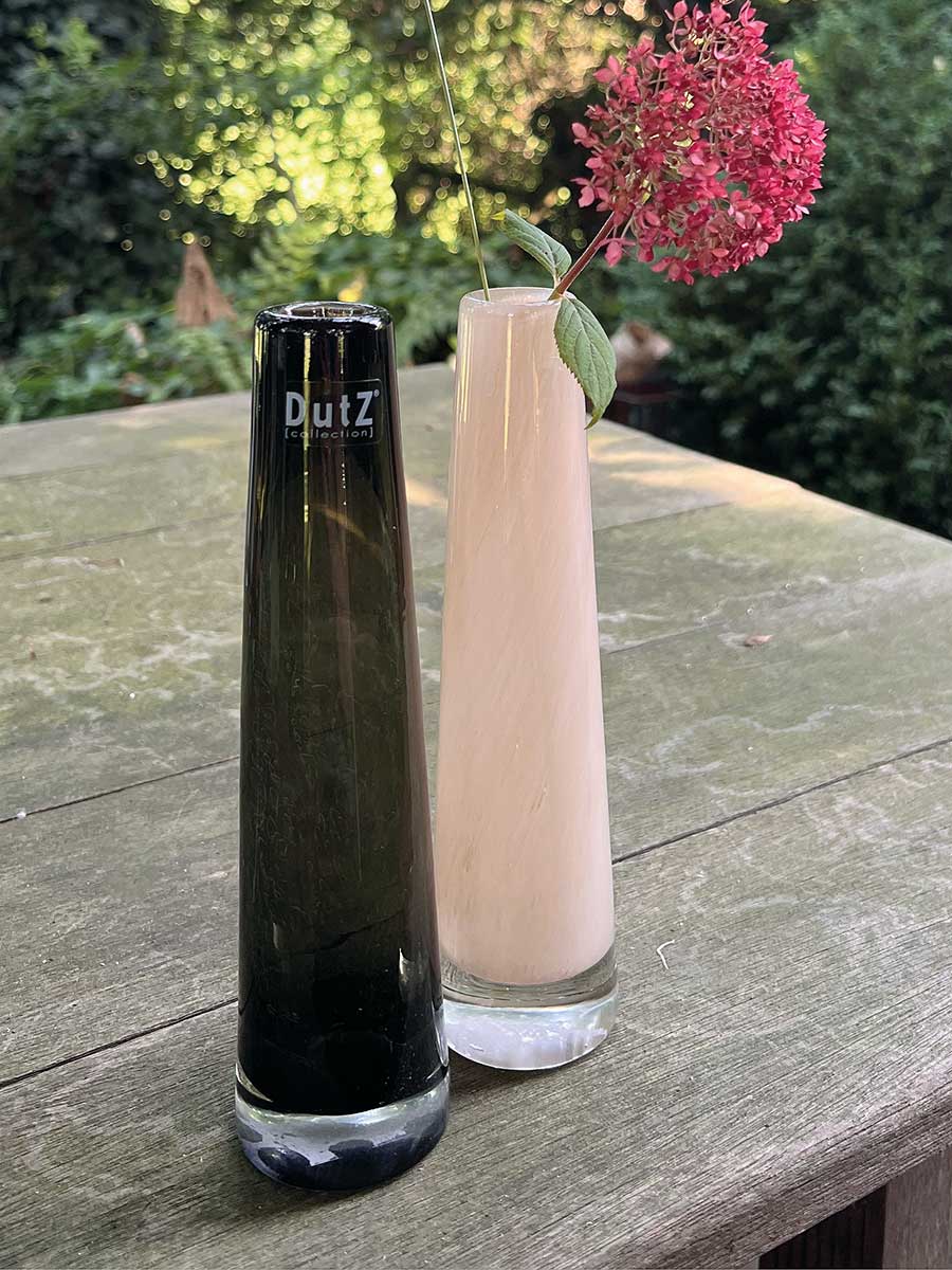 Elegante Glasvase von DutZ Collection aus solidem Glas, ideal für Einzelblumen, Gräser oder Zweige. Die hochwertigen Produkte aus der traditionellen Glasbläserei sind mundgeblasen und fallen daher immer etwas unterschiedlich aus, jeder Artikel ist ein handwerkliches Unikat, Luftblasen sind kein Mangel, sondern ein Zeugnis des Handwerks. Das Glas wird gefärbt geformt, daher gibt es kein verblassen oder auswaschen.