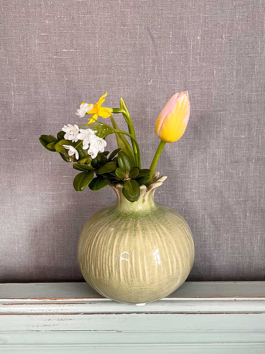 Außergewöhnliche Keramikvase Ina in grün krakelee. Die Vase erinnert an einen Granatapfel und eignet sich prima für 3-5 kurzstielige Blumen
