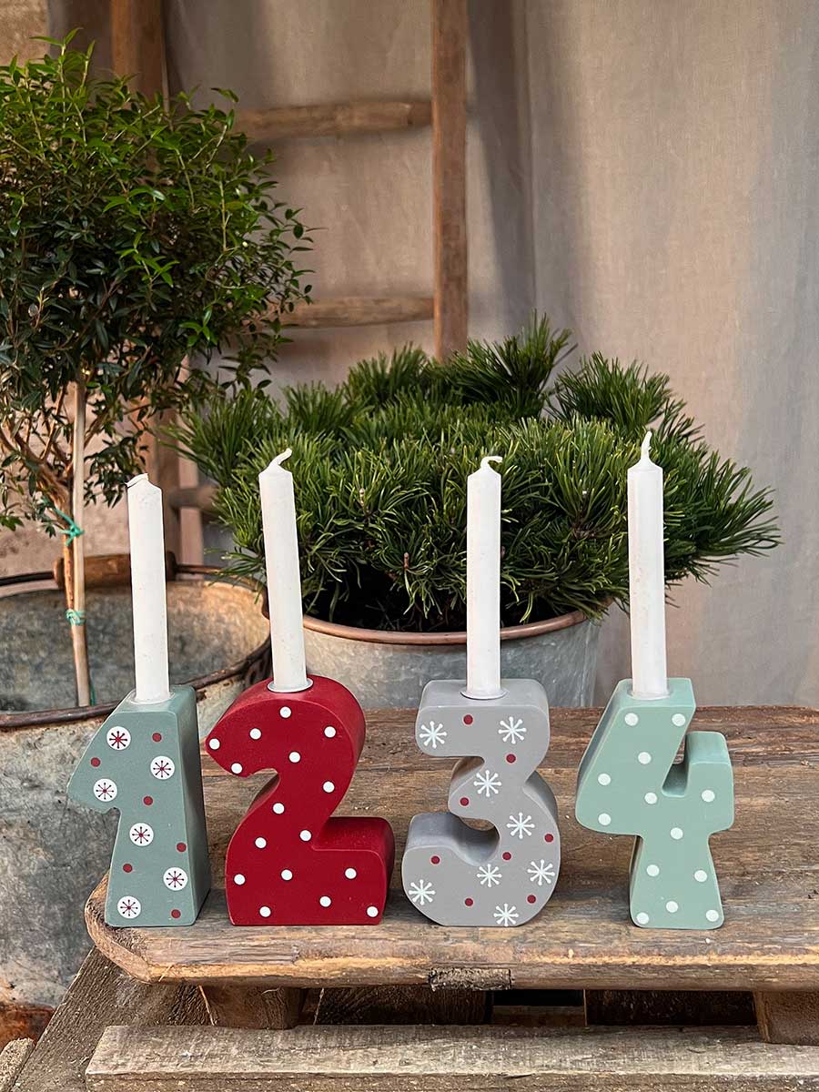 Diese hübschen Holzziffern von der dänischen Firma MADLEYS sind eine tolle Alternative zum klassischen Adventskranz. Mit dünnen Stabkerzen bestückt werden sie zum lebendigen Adventshighlight und lassen sich immer wieder neu arrangieren. Die Holzziffern in diesem Set sind verschieden farbig mit Dekorbemalung.