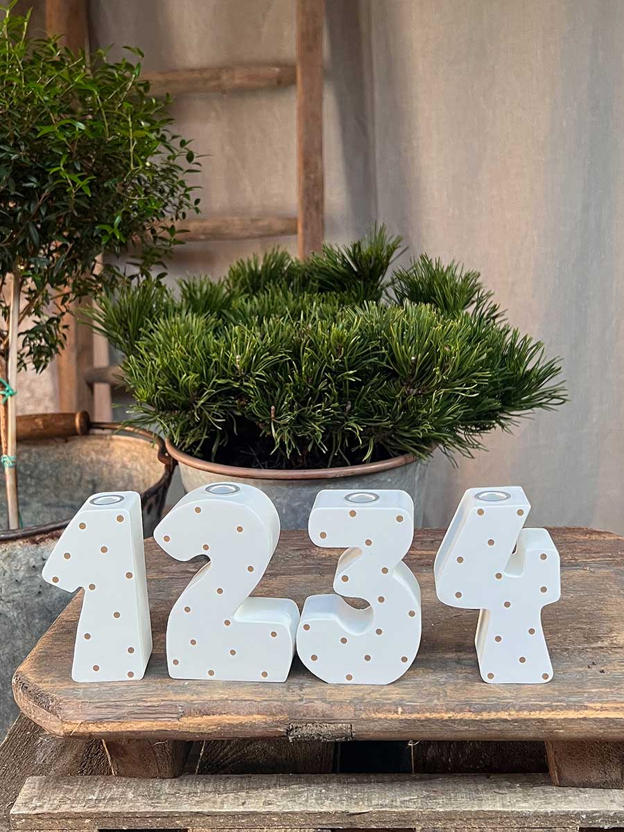Diese hübschen Holzziffern von der dänischen Firma MADLEYS in weiß mit goldenen Punkten sind eine tolle Alternative zum klassischen Adventskranz. Mit dünnen Stabkerzen bestückt werden sie zum lebendigen Adventshighlight und lassen sich immer wieder neu arrangieren.
