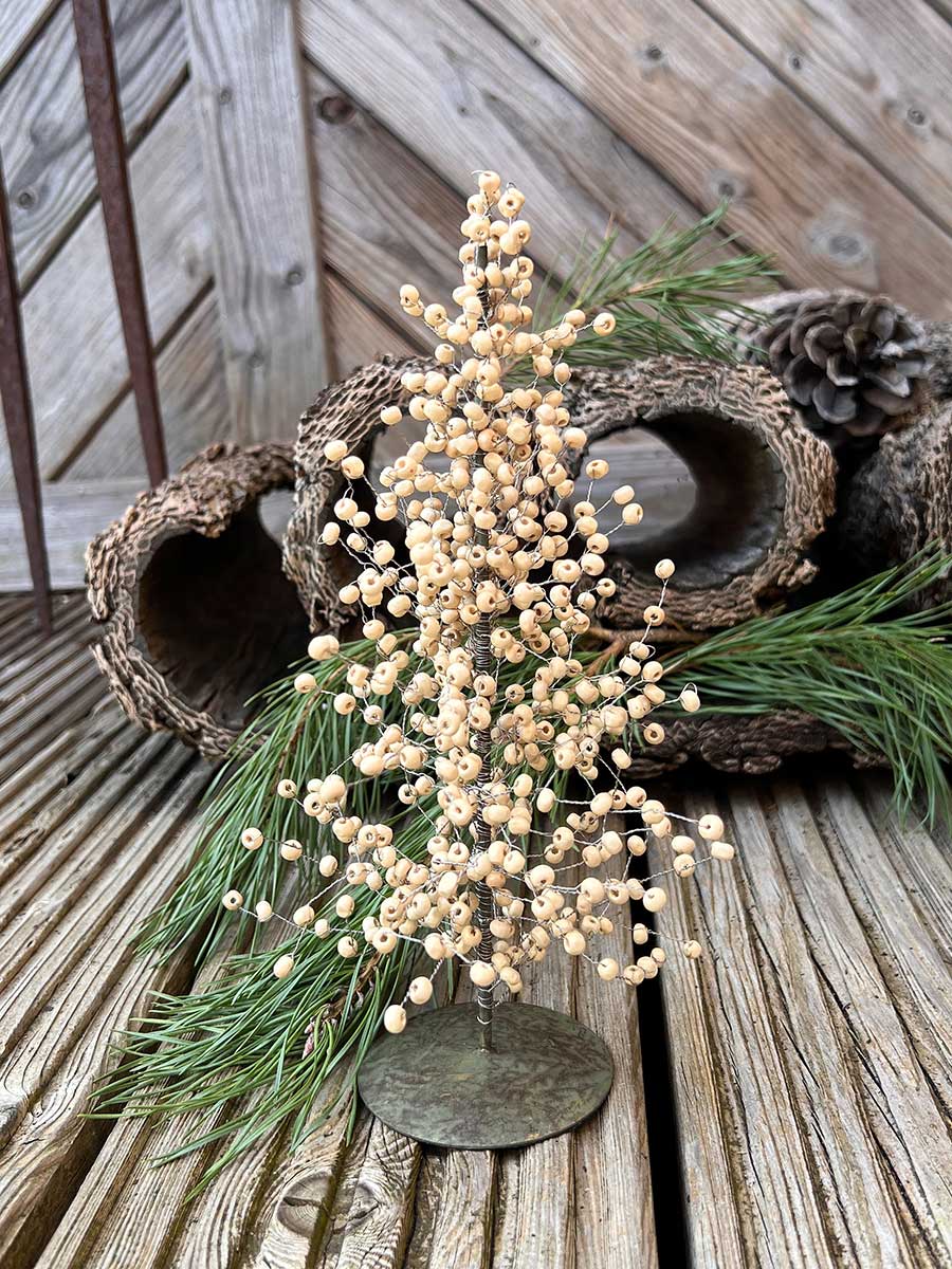 Ausgefallener Tannenbaum - Metallständer mit auf Draht gewickelten Holzperlen von IB Laursen. Stimmungsvolle skandinavische Winter- und Weihnachtsdekoration.