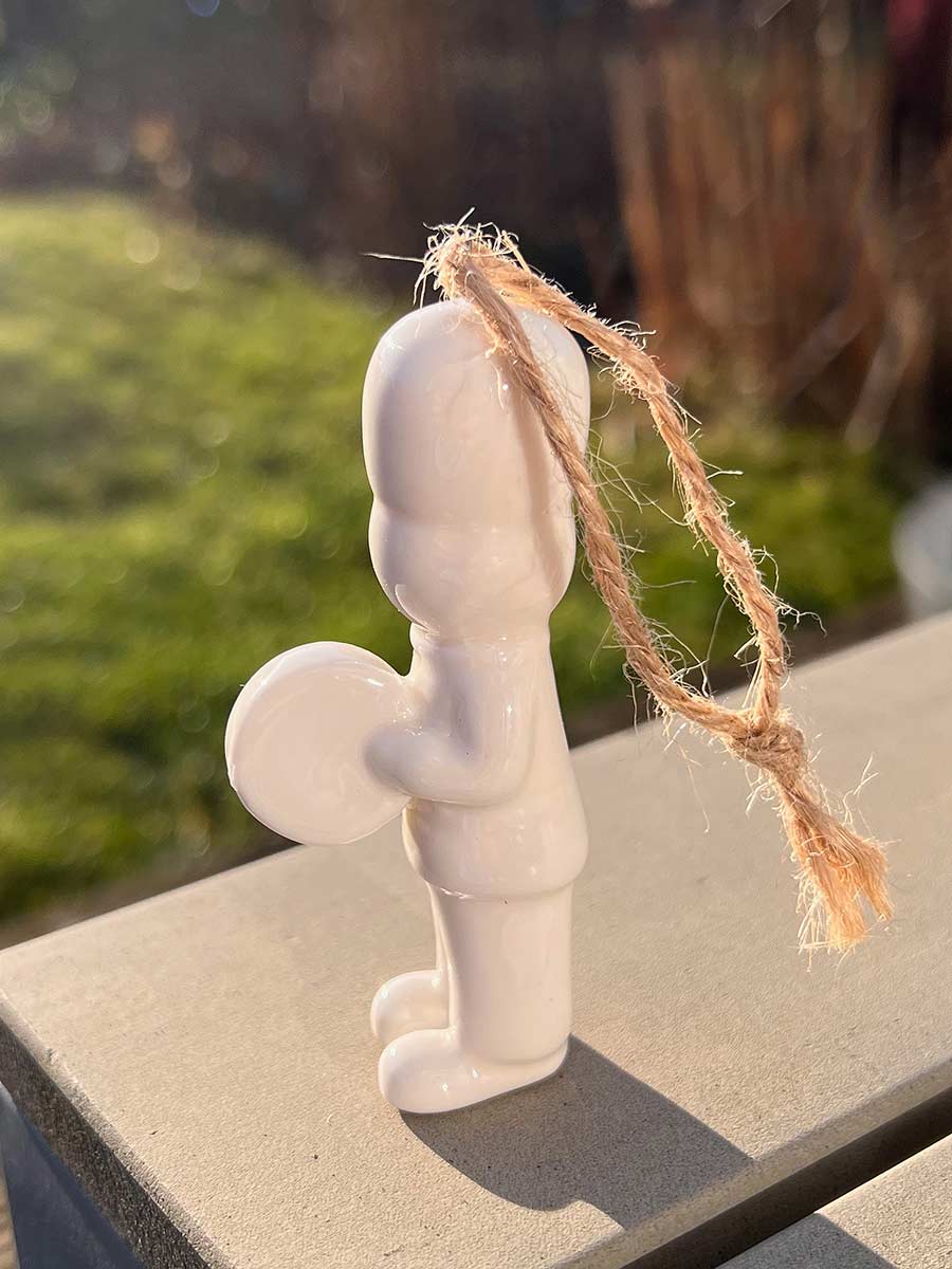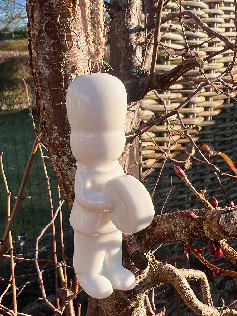 Weißer Porzellan Gardist mit Becken. Zeitlos elegante Weihnachtsdekoration zum Aufhängen.