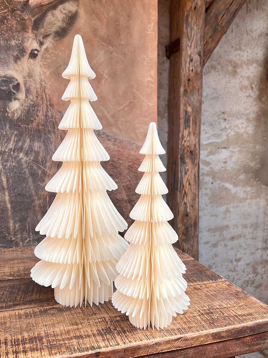 Zauberhafter Papier Falt-Tannenbaum in creme mit Magnetverschluß. Diese Serie ist die perfekte Ergänzung zu den Papier-Faltkränzen. Zur Lagerung läßt sich der Baum platzsparend zusammenfalten.