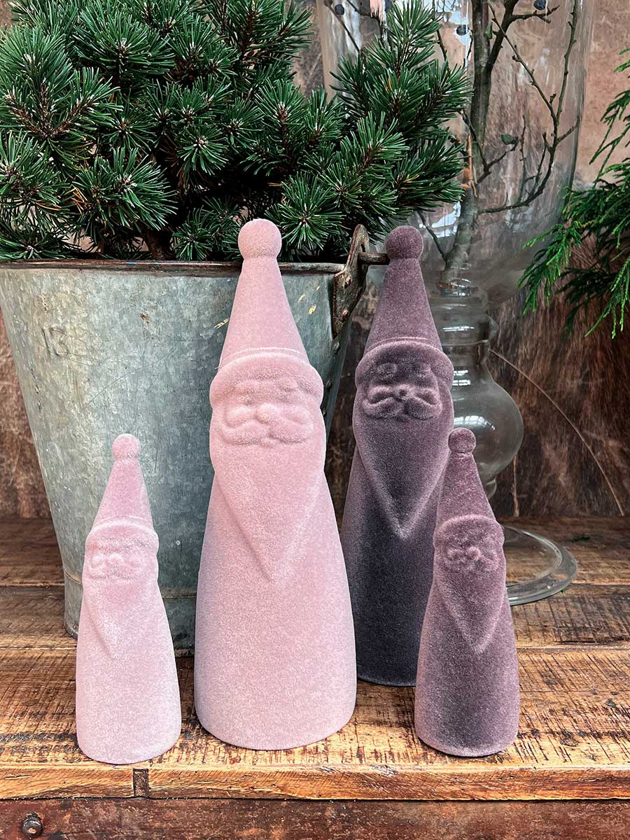 Dieser samtig stylische Weihnachtsmann in graubraun ist ein außergewöhnlicher Blickfang. Er steht am liebsten in Kombination mit den anderen Farben und Größen und den samtigen Tannenbäumen und Hirschköpfen.