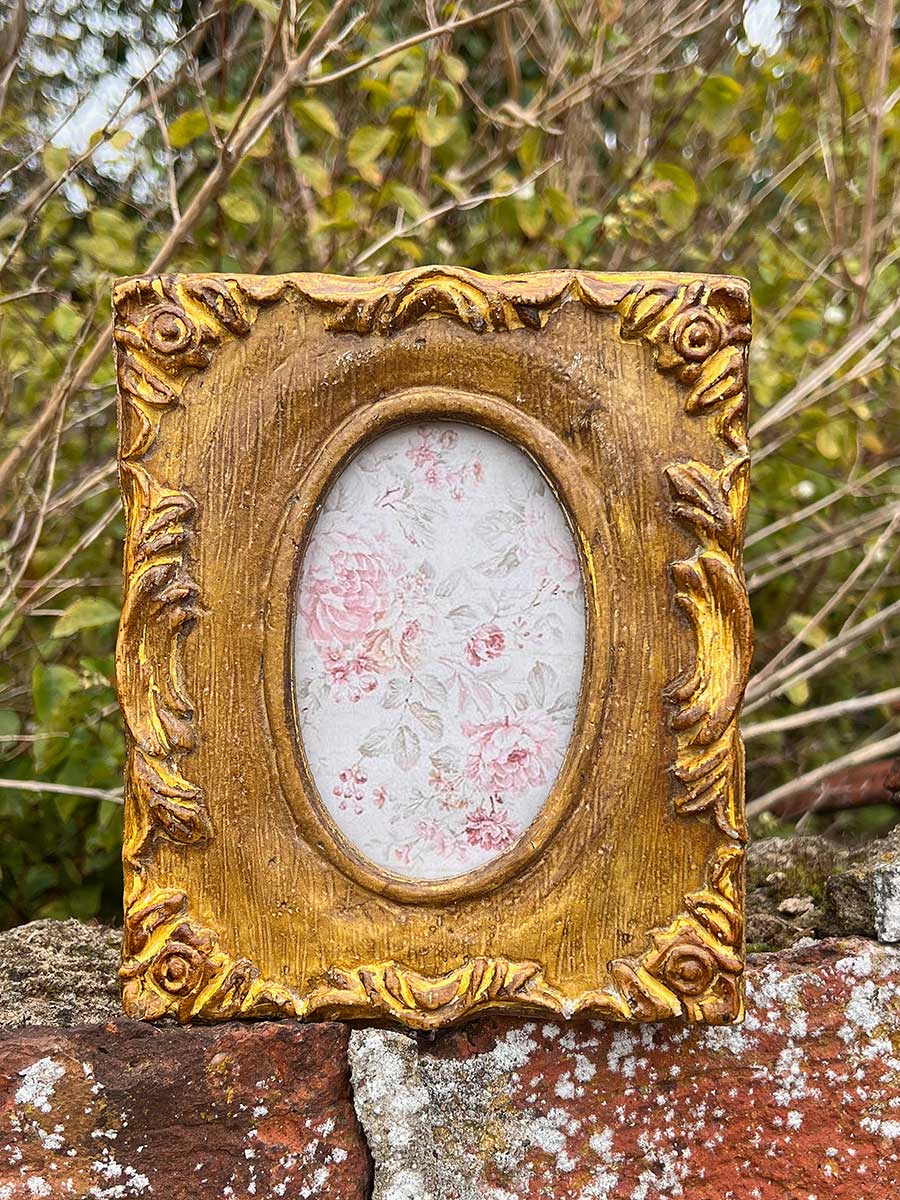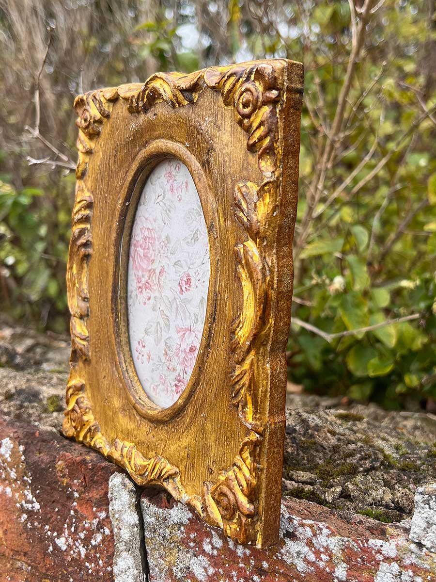 Nostalgisch anmutender Vintage Bilderrahmen in verzierter Holzoptik mit ovalem Bildausschnitt. Der Rahmen kann aufgestellt und aufgehängt werden.