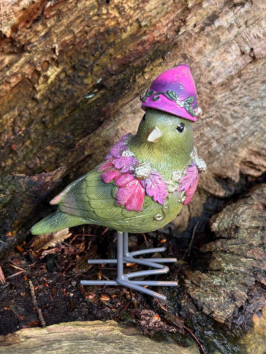 Liebevoll verzierter grüner Dekovogel mit pinkem Kranz um den Hals, Kunstoffkörper auf Metallfüssen
