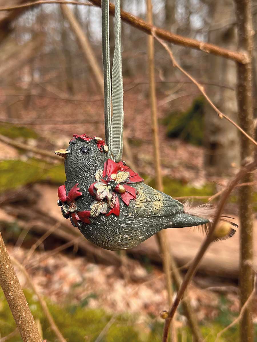 Liebevoll verzierter grüner Dekovogel mit rotem Kranz um den Hals und Vogelfeder, Anhänger mit Samtbändchen