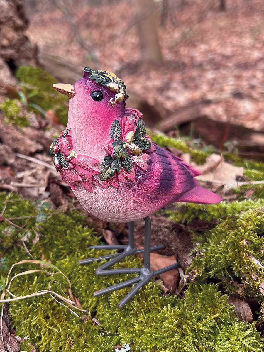 Liebevoll verzierter pinker Dekovogel mit grünem Blätterkranz um den Hals, Kunstoffkörper auf Metallfüssen