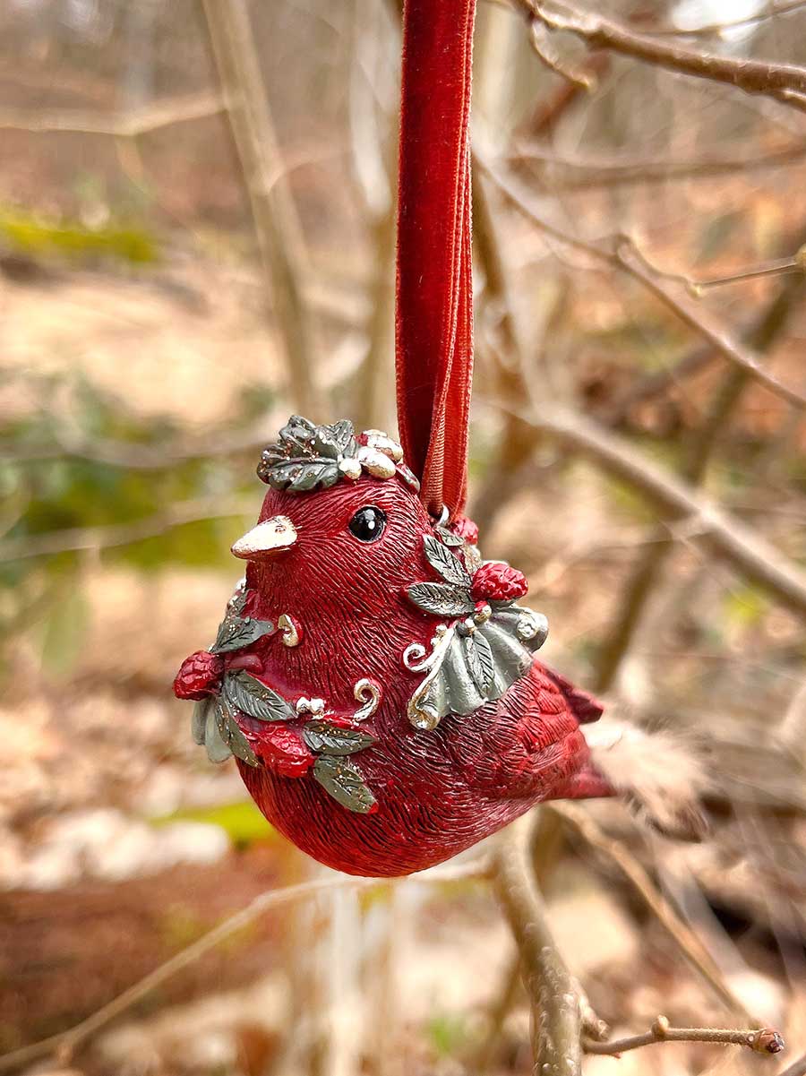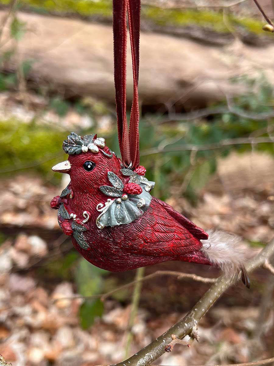 Liebevoll verzierter roter Dekovogel mit grünem Kranz um den Hals und Vogelfeder, Anhänger mit Samtbändchen