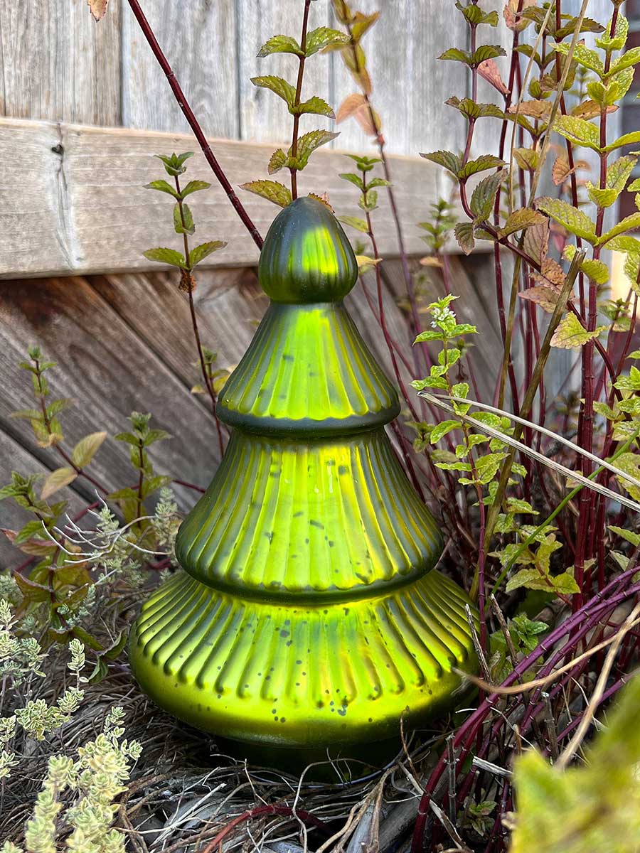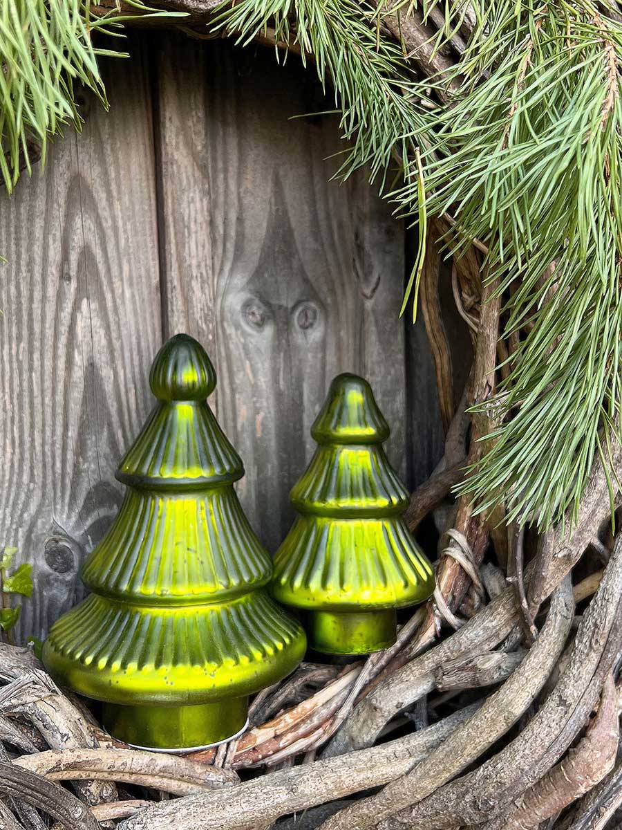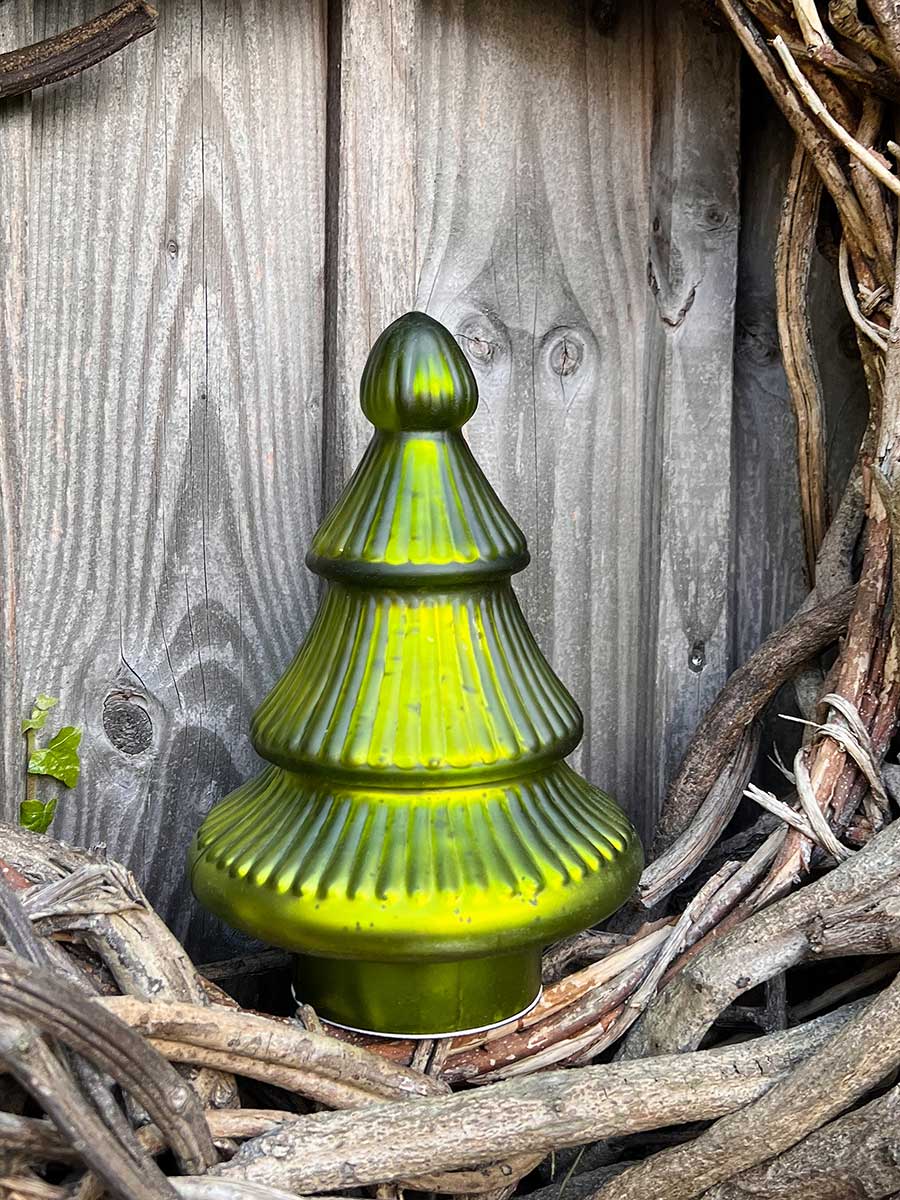 Stimmungsvoller Glastannenbaum in grün matt, tolle Herbst- und Winterdekoration. Die Glastanne wirkt besonders hübsch in Kombination mit den anderen Farben und Größen.