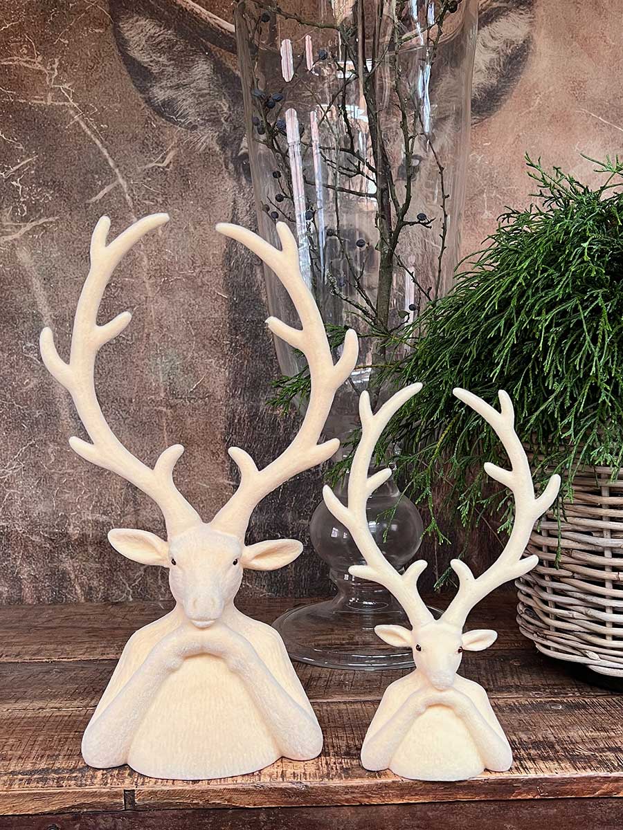 Dieser samtig stylische Hirschkopf in beige sand ist ein außergewöhnlicher Blickfang. Diese Hirschkopf-Büste schaut gelassen mit zusammengelegten Hufen in den Raum und steht am liebsten in Kombination mit weiteren Farben und Größen.