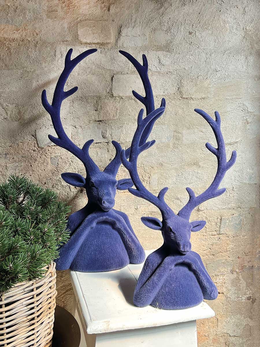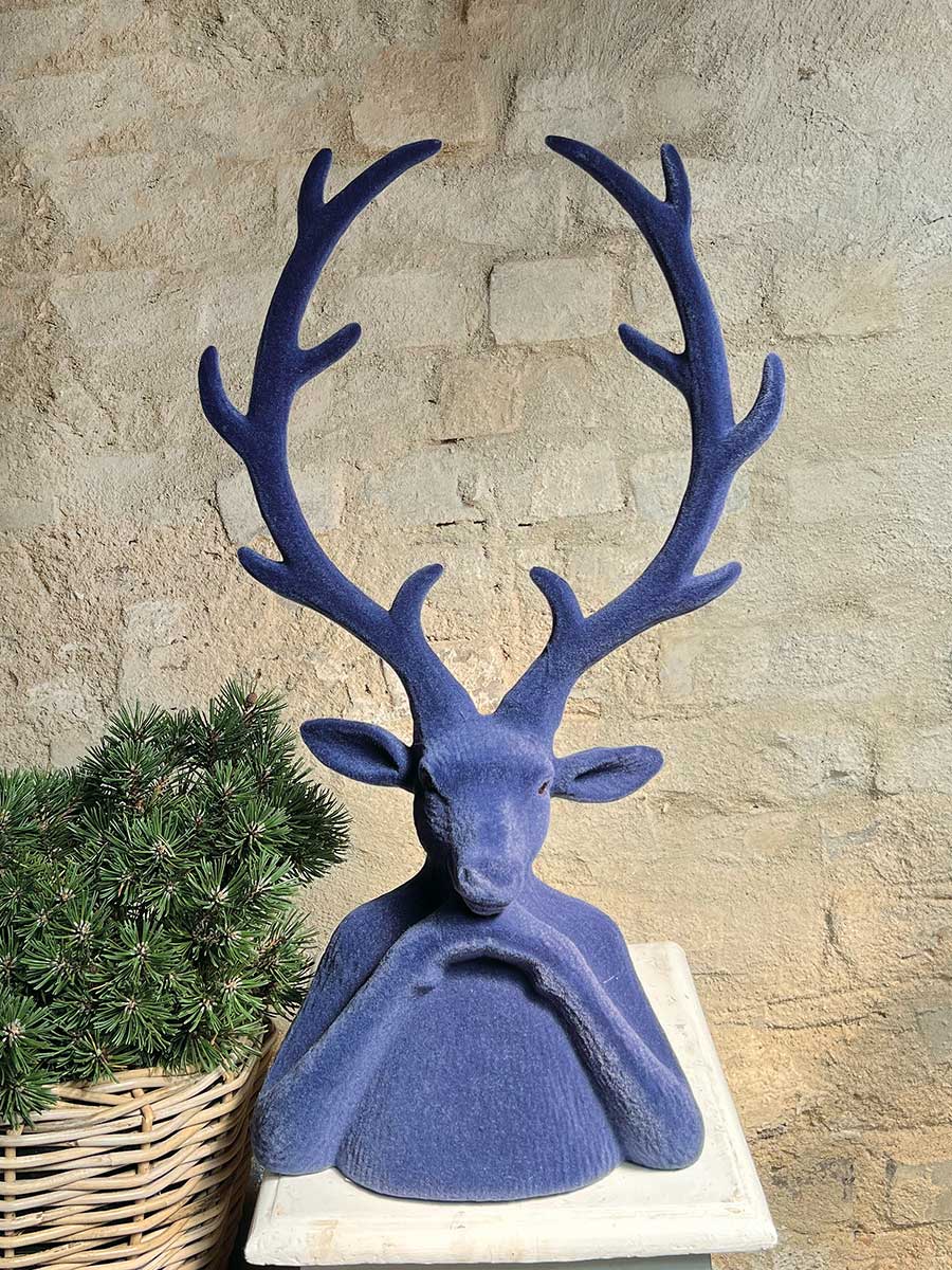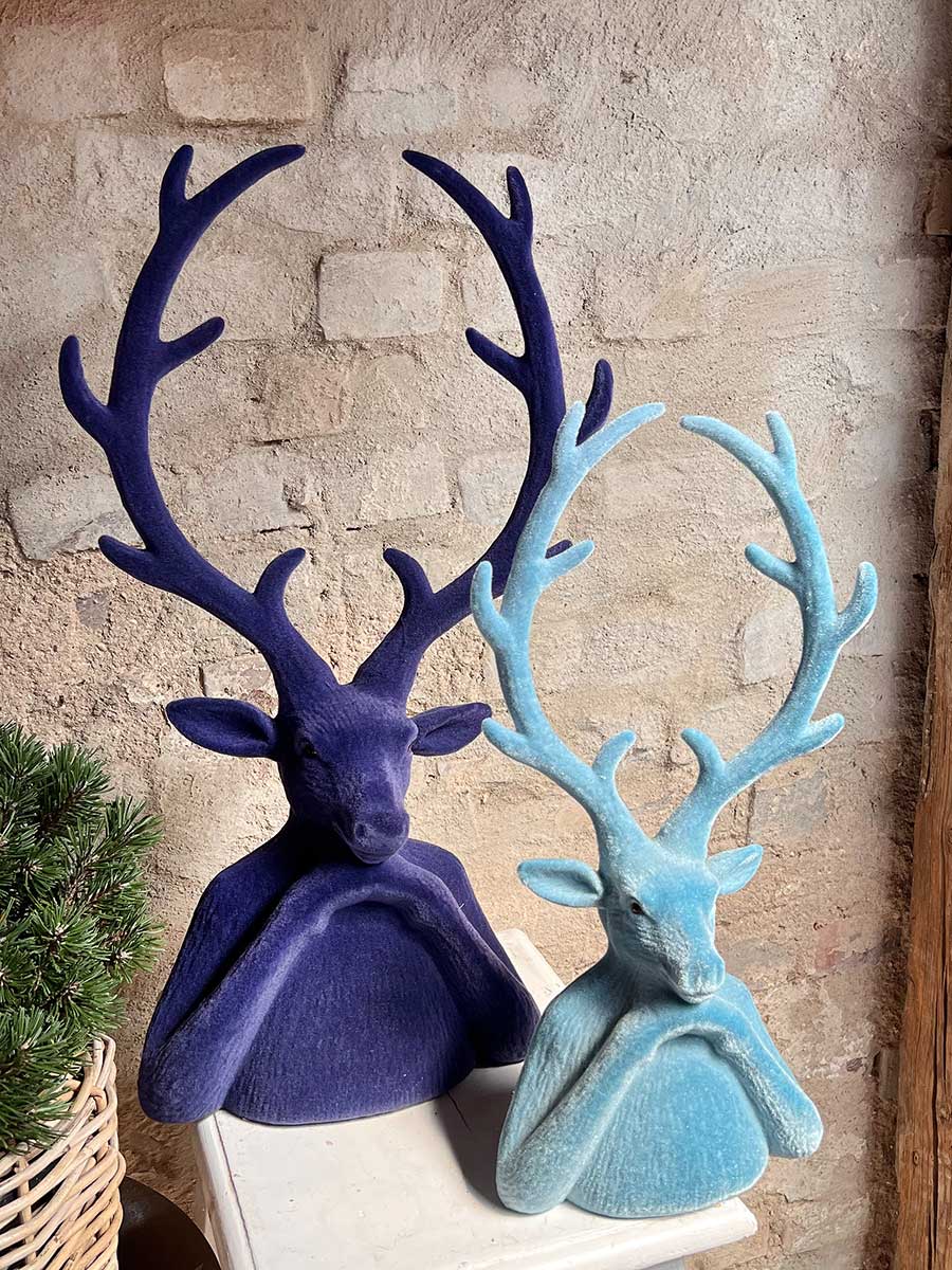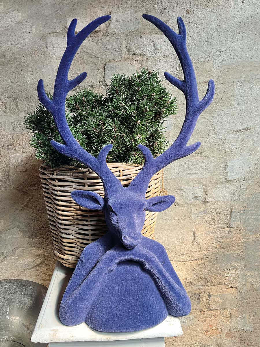 Dieser samtig stylische Hirschkopf in blau ist ein außergewöhnlicher Blickfang. Diese Hirschkopf-Büste schaut gelassen mit zusammengelegten Hufen in den Raum und steht am liebsten in Kombination mit weiteren Farben und Größen.