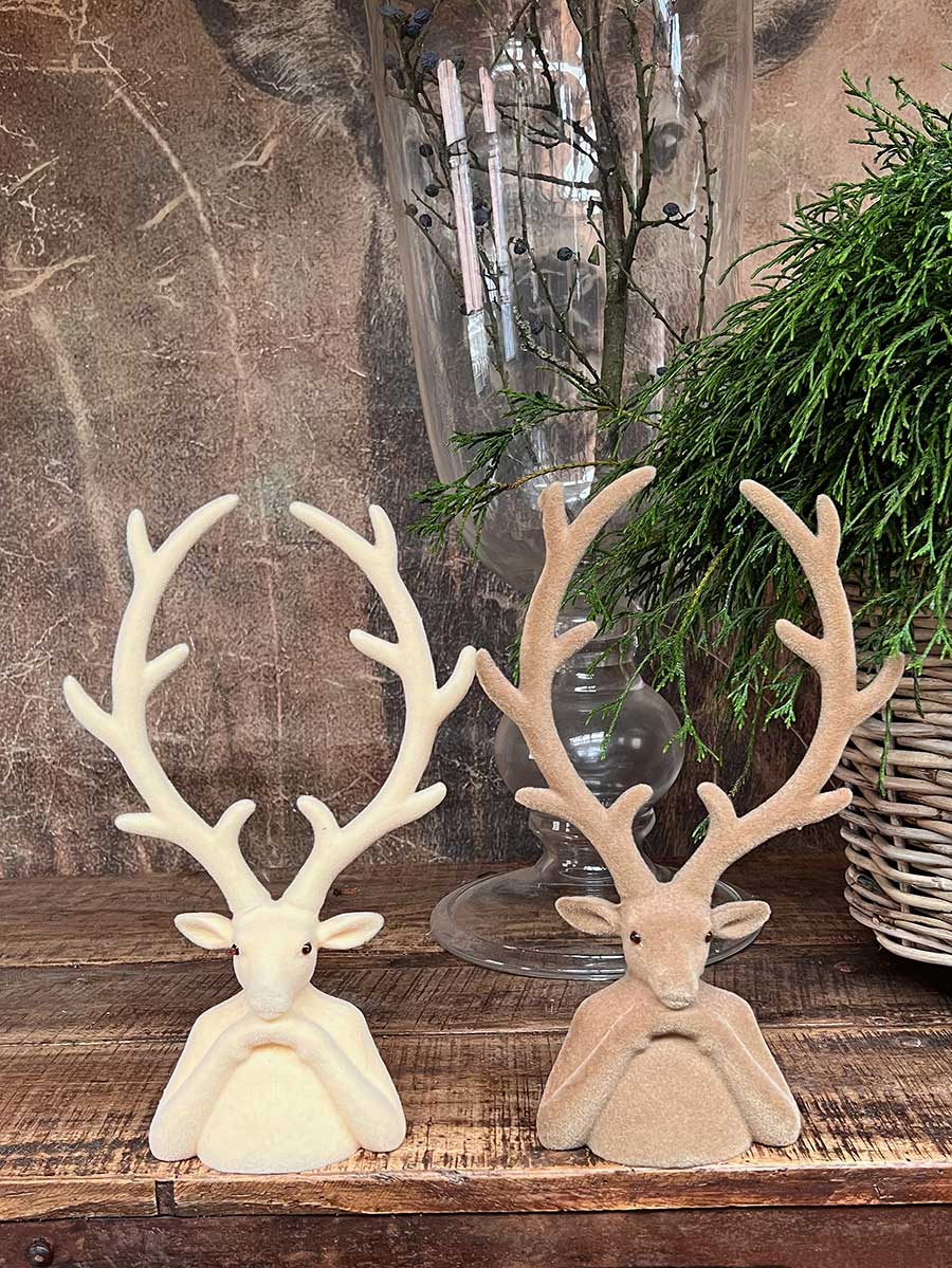 Dieser samtig stylische Hirschkopf in braun ist ein außergewöhnlicher Blickfang. Diese Hirschkopf-Büste schaut gelassen mit zusammengelegten Hufen in den Raum und steht am liebsten in Kombination mit weiteren Farben und Größen.