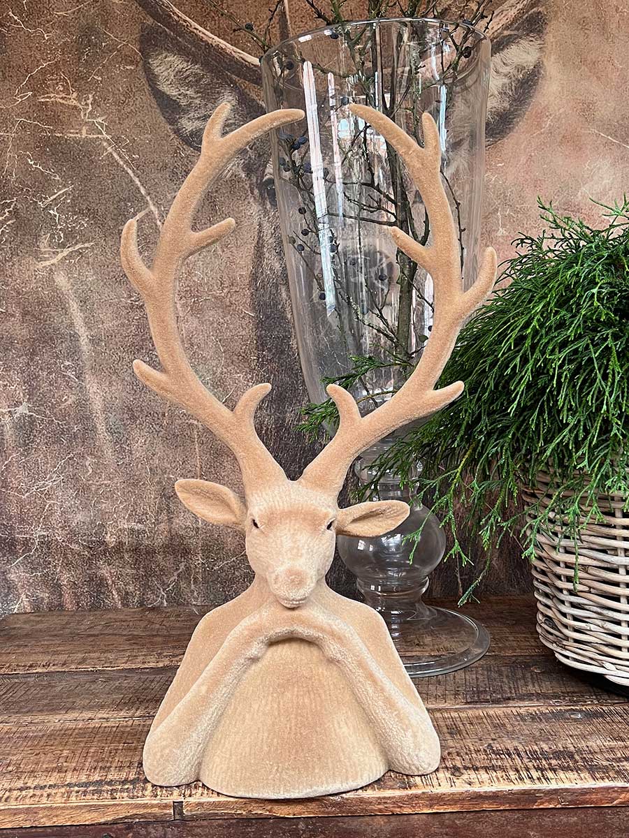Dieser samtig stylische Hirschkopf in braun ist ein außergewöhnlicher Blickfang. Diese Hirschkopf-Büste schaut gelassen mit zusammengelegten Hufen in den Raum und steht am liebsten in Kombination mit weiteren Farben und Größen.