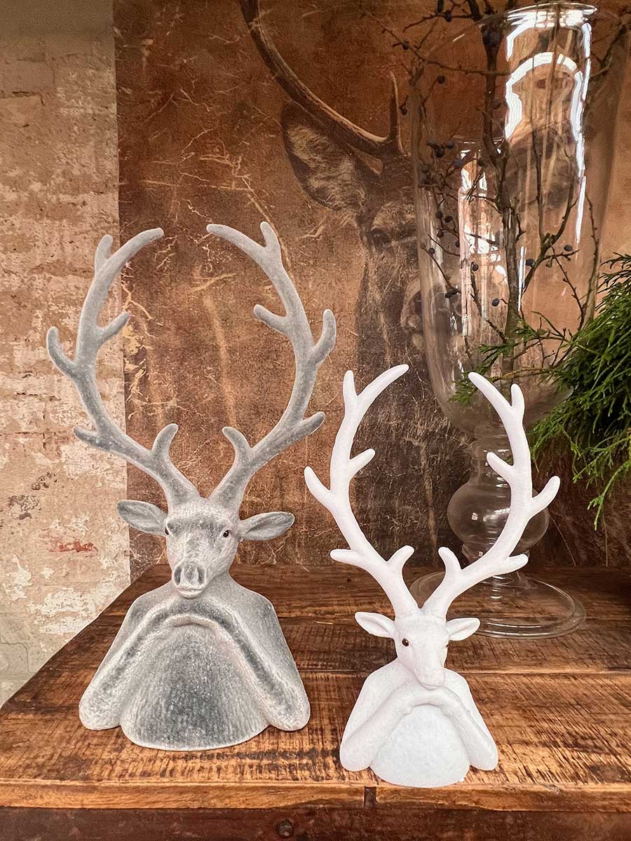 Dieser samtig stylische Hirschkopf in weiß ist ein außergewöhnlicher Blickfang. Diese Hirschkopf-Büste schaut gelassen mit zusammengelegten Hufen in den Raum und steht am liebsten in Kombination mit weiteren Farben und Größen.