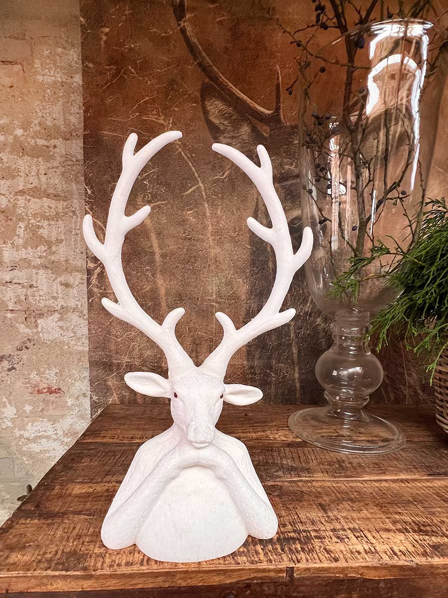 Lieferumfang: 1 Hirschkopf Tasko beflockt weiß H45
