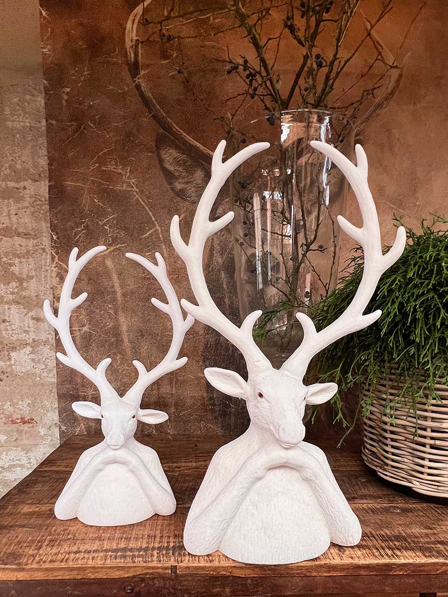 Dieser samtig stylische Hirschkopf in weiß ist ein außergewöhnlicher Blickfang. Diese Hirschkopf-Büste schaut gelassen mit zusammengelegten Hufen in den Raum und steht am liebsten in Kombination mit weiteren Farben und Größen.