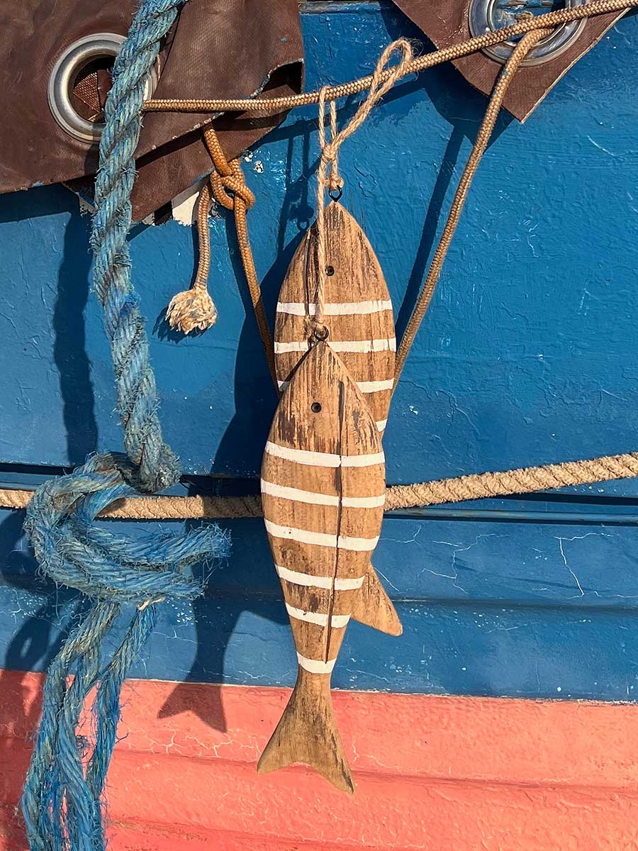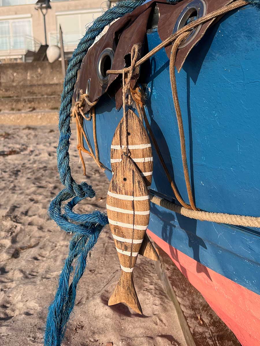 2 weiß gestreifte Holzfische Fische maritim am Tampen