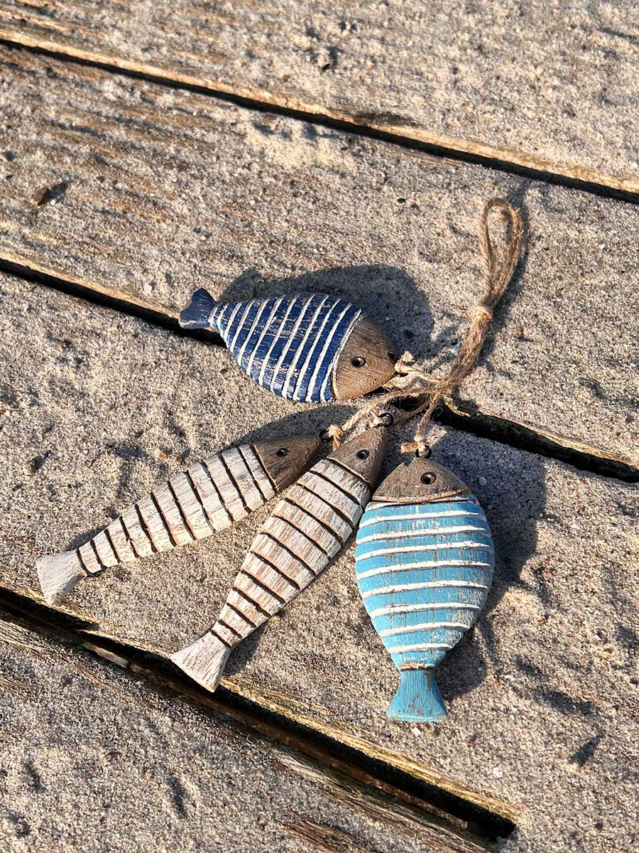 4 blau weiß gestreifte Holzfische am Tampen - stimmungsvolle maritime Dekoration, die in allen Wohnbereichen zum Einsatz kommt, ob Wohnzimmer, Badezimmer, Eingangsbereich oder Wintergarten. Holen Sie sich nordisch maritimes Wohnflair in Ihr Zuhause oder setzen Sie maritime Akzente in der Ferienwohnung.