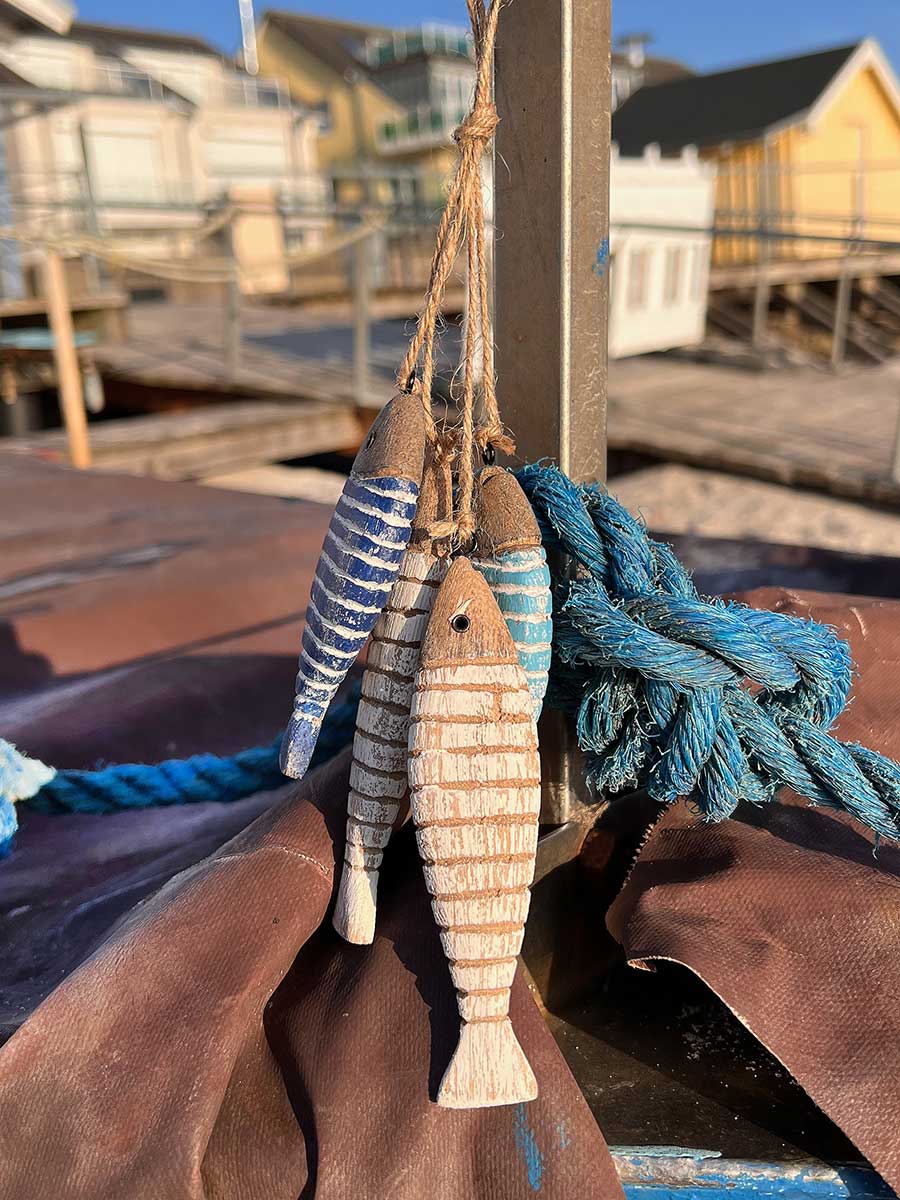 4 blau weiß gestreifte Holzfische Fische maritim am Tampen
