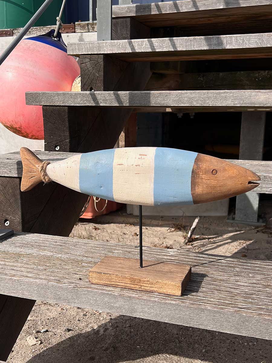 Weiß blau gestreifter Holzfisch maritim auf Fuß H26
