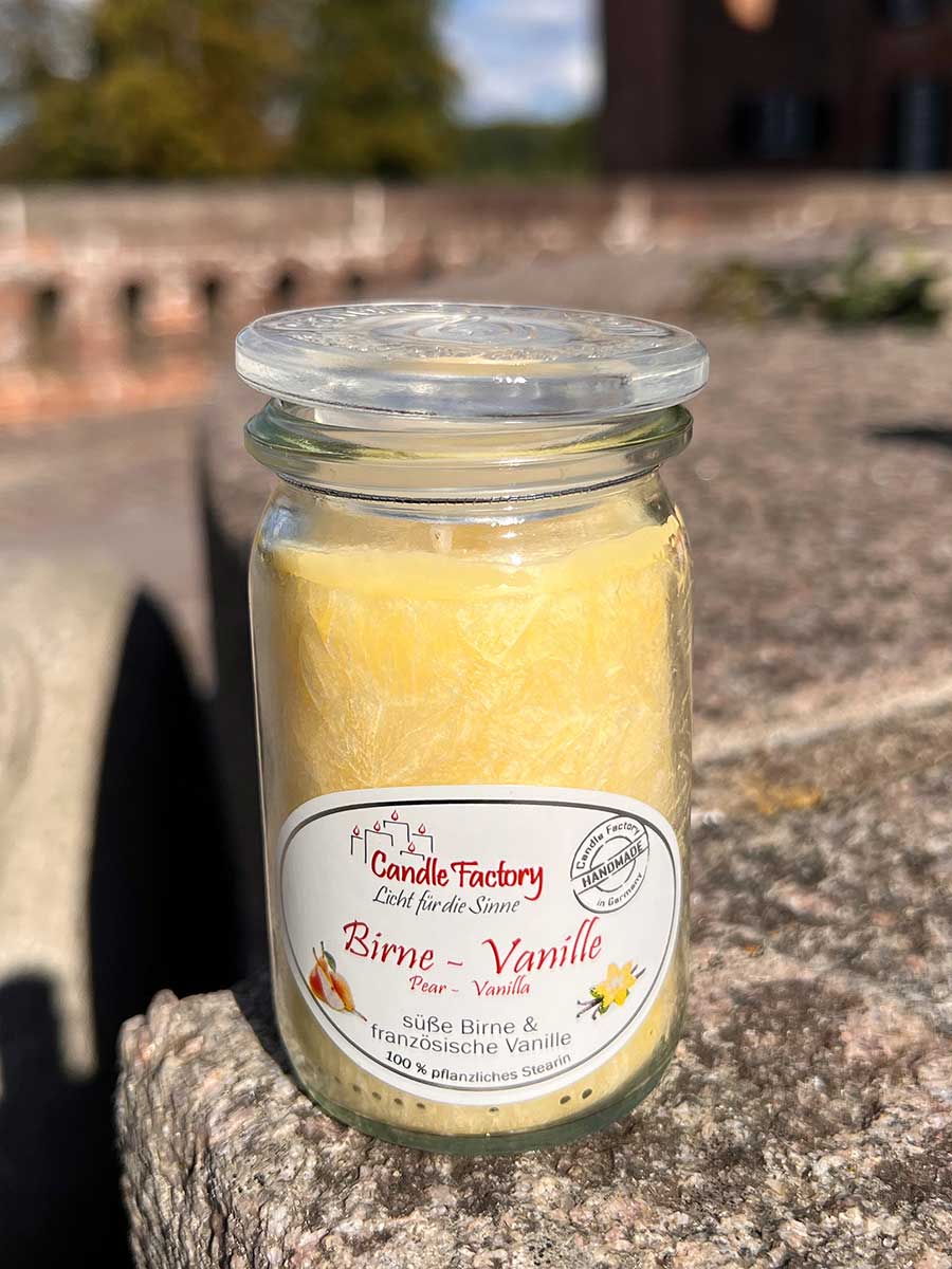 Lieferumfang: 1 Candle Factory Baby-Jumbo Duft-Kerze im Weckglas Birne Vanille