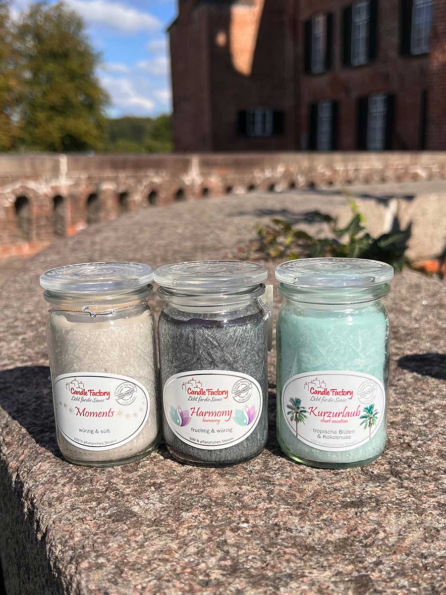 Die handgefertigten Kerzen sind "Made in Germany" und bestehen zu 100 % aus pflanzlichem Stearin. Sie heben sich durch eine einzigartige kristalline Oberflächenstruktur hervor und sind in ein hochwertiges, hitzebeständiges Weck-Glas gegossen. Mit dem Glasdeckel läßt sich die Flamme leicht und sicher ersticken.