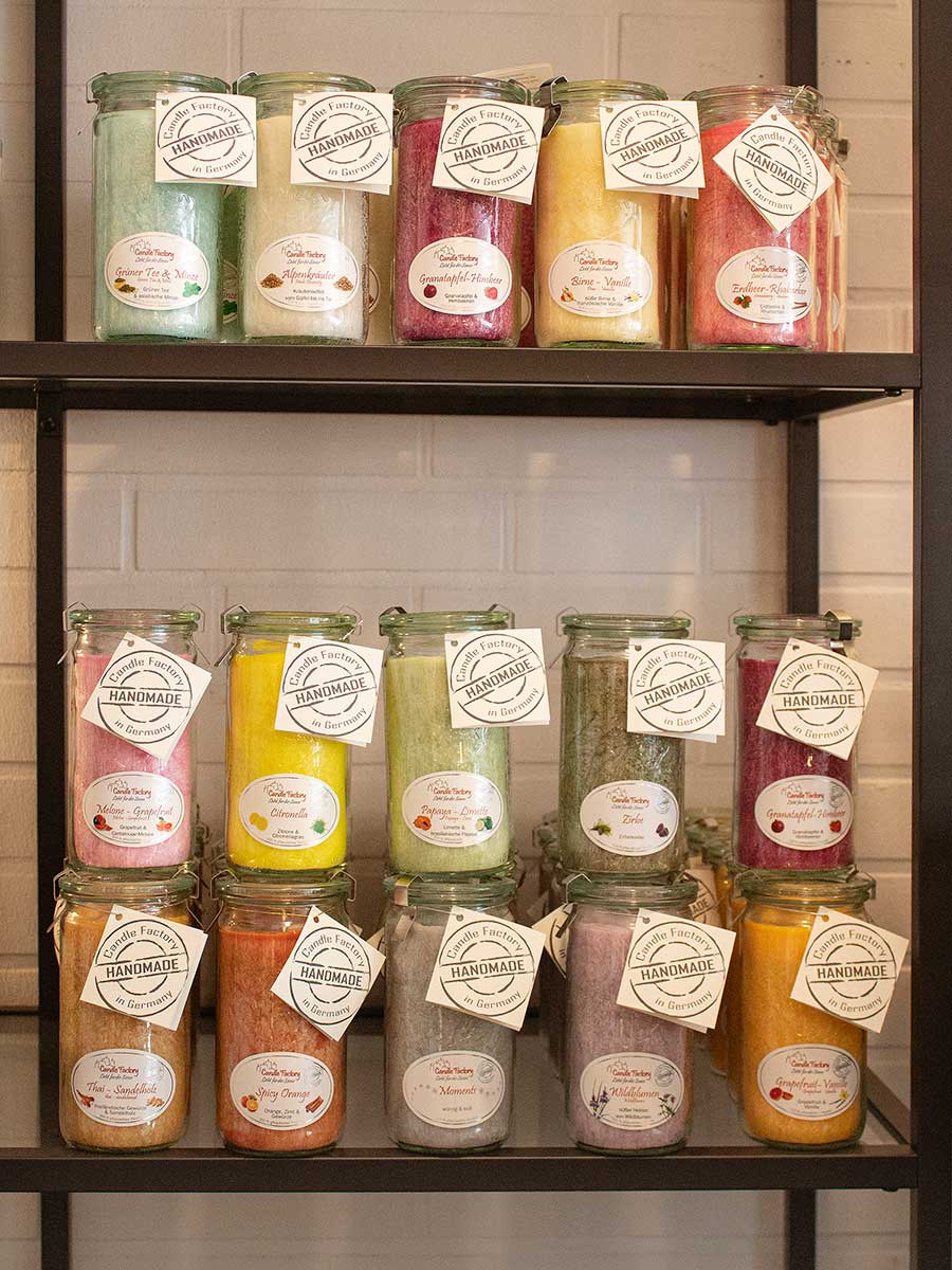 Die handgefertigten Kerzen sind "Made in Germany" und bestehen zu 100 % aus pflanzlichem Stearin. Sie heben sich durch eine einzigartige kristalline Oberflächenstruktur hervor und sind in ein hochwertiges, hitzebeständiges Weck-Glas gegossen. Mit dem Glasdeckel läßt sich die Flamme leicht und sicher ersticken.