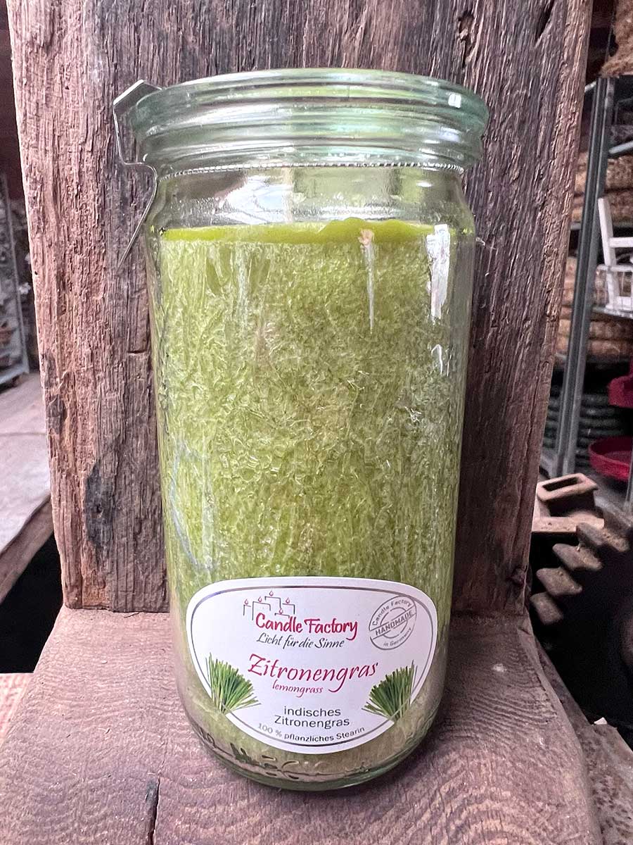 Außergewöhnliche Kerze mit einem würzigen Duft nach Zitronengras von Candle Factory - Licht für die Sinne, ausgezeichnet als nachhaltiges Trendprodukt des Jahres 2019/20