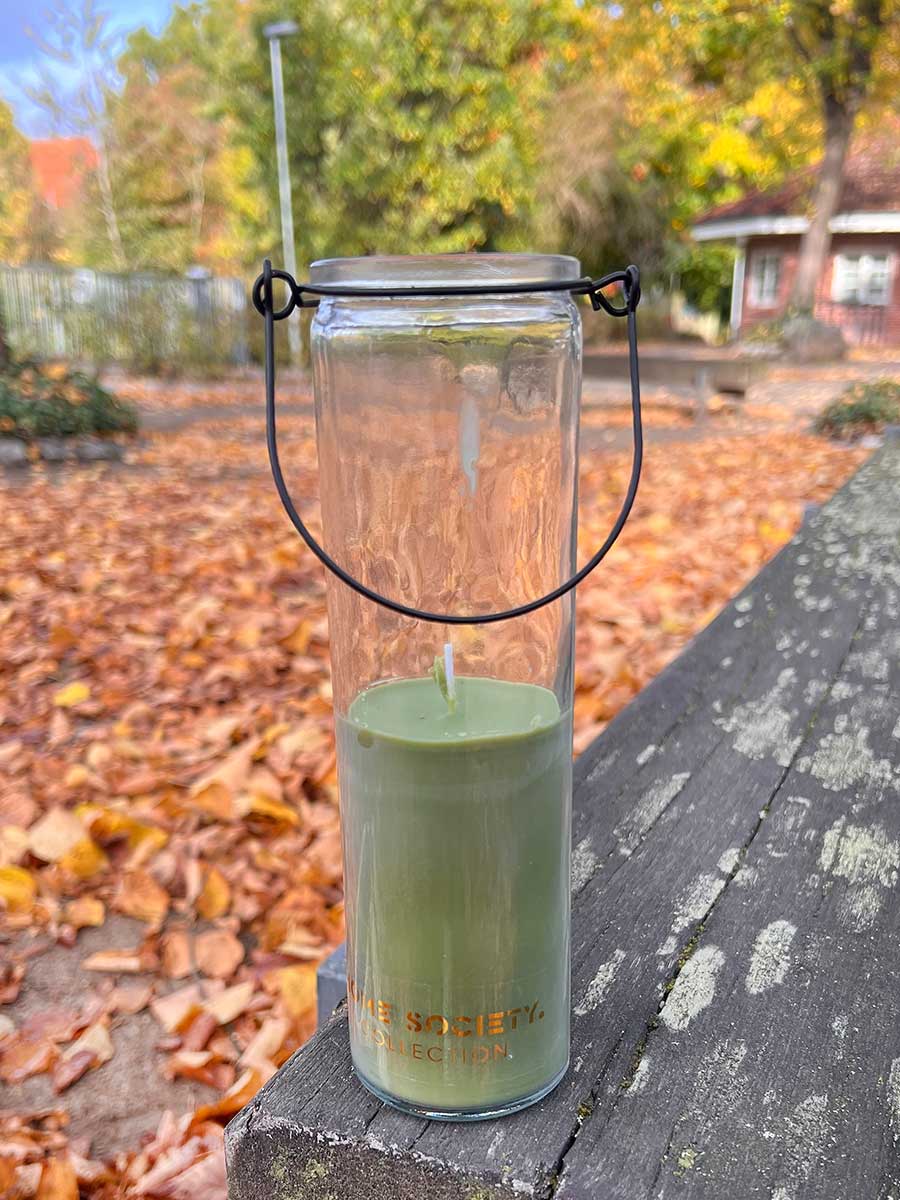 Lieferumfang: 1 Home Society Candle Tube Kerze Frank im Hängeglas grün