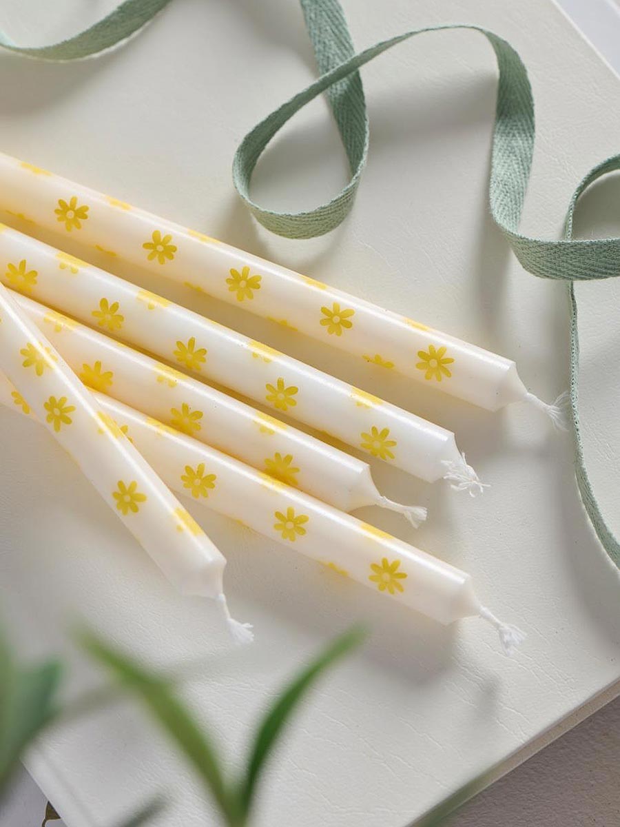 Hübsche schmale 20 cm lange Stabkerze von IB Laursen Motiv: gelbe Blumen im praktischen 4er Pack.