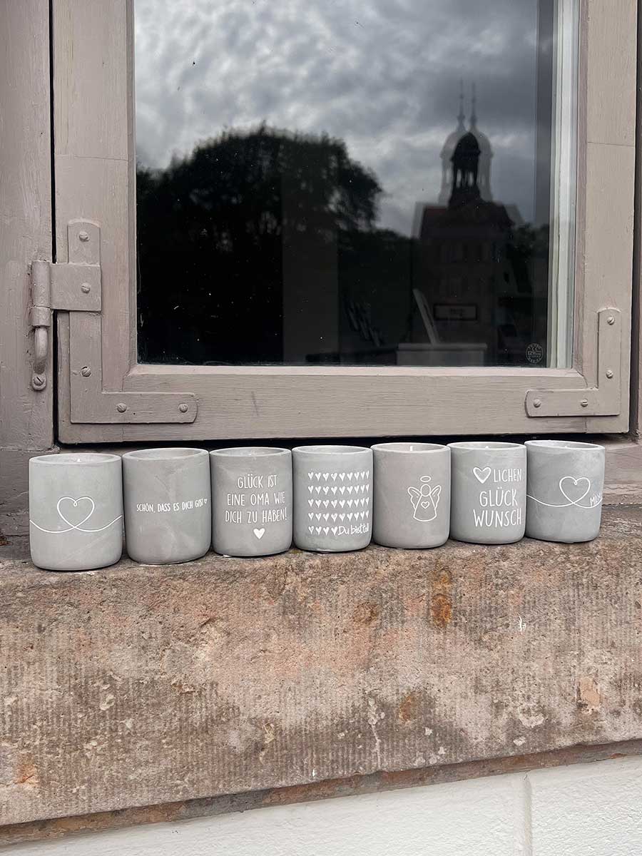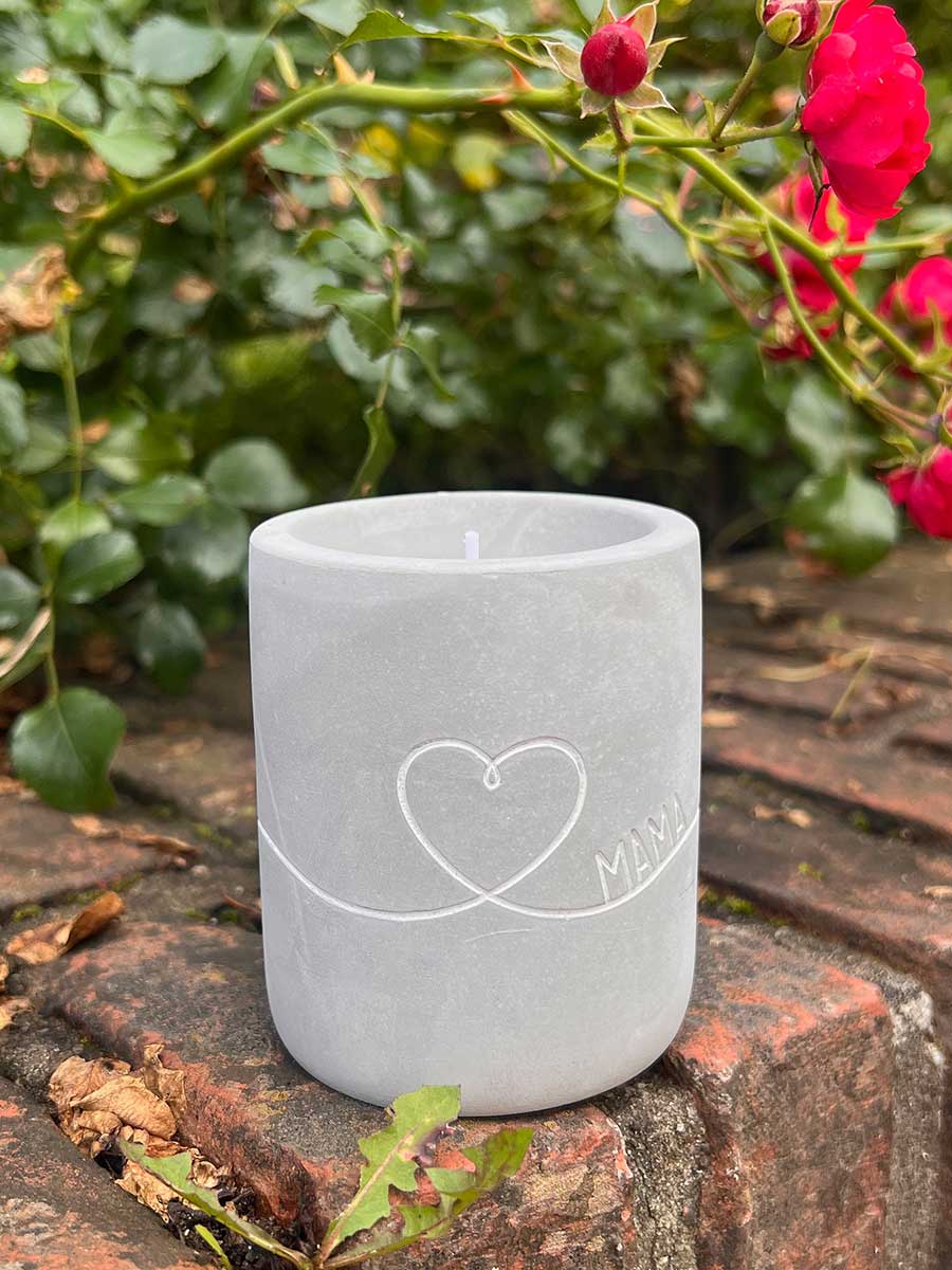 Trendige kleine Betonkerze mit Gravur: Herz geschwungen Mama von MEA Living. Das Wachs besteht zu 100 % aus Paraffin, Brenndauer ca. 12 Stunden. Die Betonkerzen sind ein zauberhaftes Mitbringsel und wirken besonders schon in Grüppchen arrangiert. Nach dem Abbrennen der Kerzen läßt sich der kleine Betonbecher prima dekorieren und bereitet lange Freude.