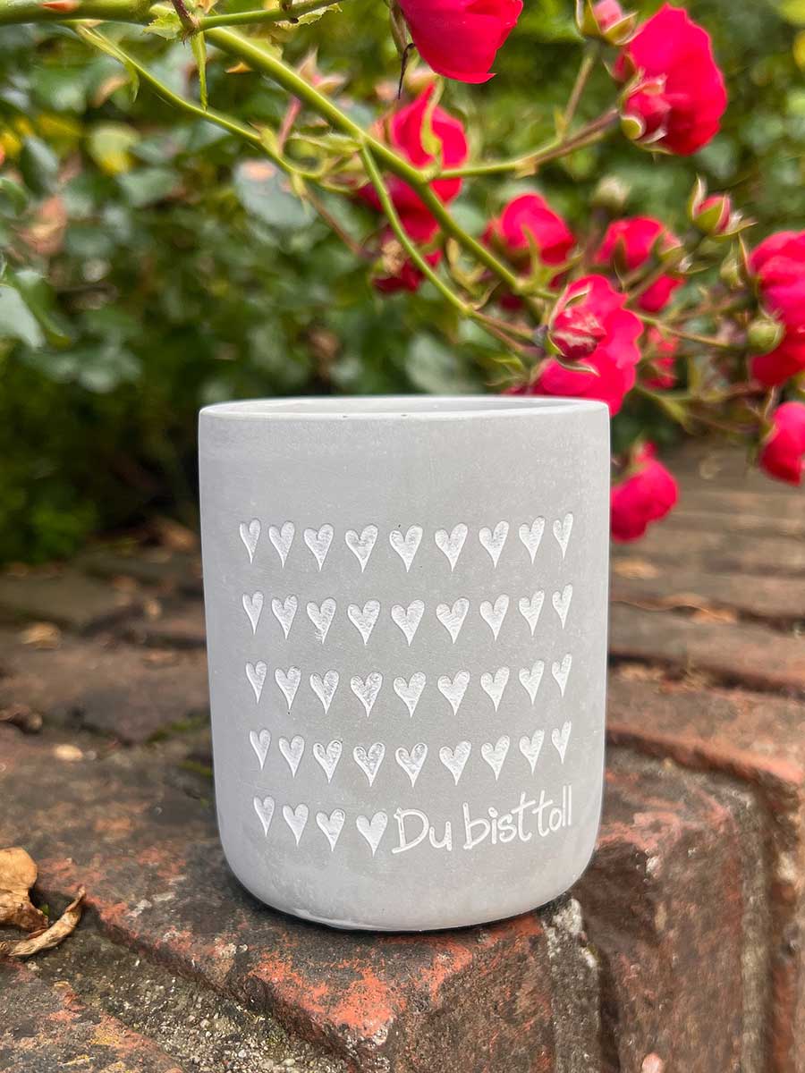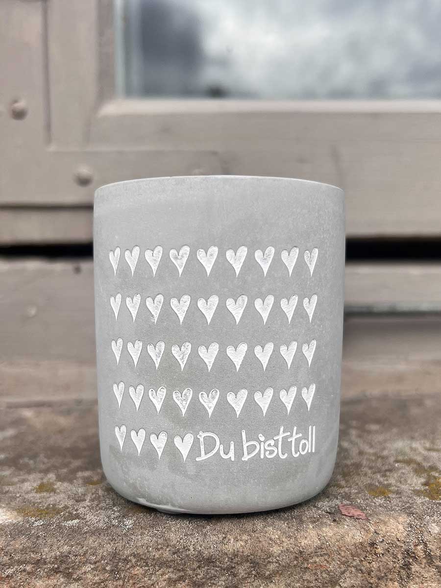 Trendige kleine Betonkerze mit Gravur: Herzen Du bist toll von MEA Living. Das Wachs besteht zu 100 % aus Paraffin, Brenndauer ca. 12 Stunden. Die Betonkerzen sind ein zauberhaftes Mitbringsel und wirken besonders schon in Grüppchen arrangiert. Nach dem Abbrennen der Kerzen läßt sich der kleine Betonbecher prima dekorieren und bereitet lange Freude.