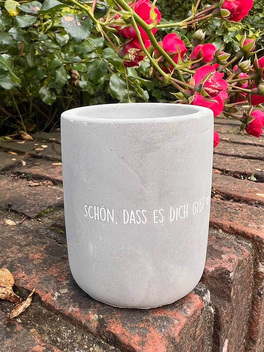 Trendige kleine Betonkerze mit Gravur: Schön, dass es Dich gibt von MEA Living. Das Wachs besteht zu 100 % aus Paraffin, Brenndauer ca. 12 Stunden. Die Betonkerzen sind ein zauberhaftes Mitbringsel und wirken besonders schon in Grüppchen arrangiert. Nach dem Abbrennen der Kerzen läßt sich der kleine Betonbecher prima dekorieren und bereitet lange Freude.