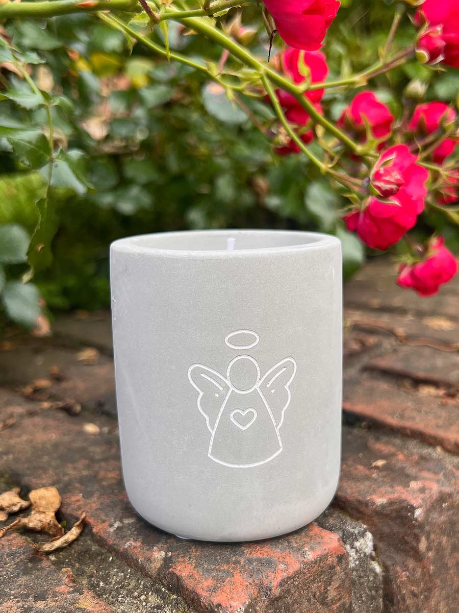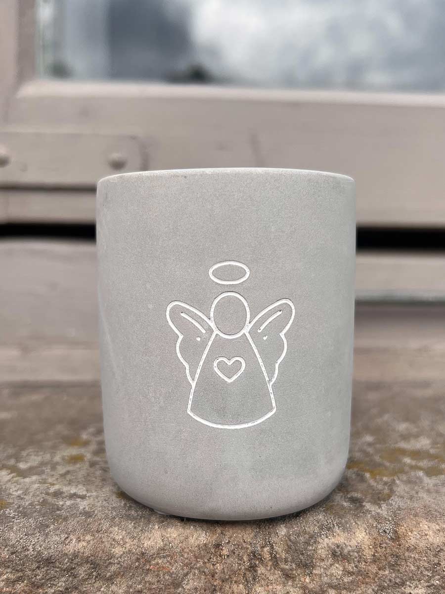 Trendige kleine Betonkerze mit Gravur: Schutzengel von MEA Living. Das Wachs besteht zu 100 % aus Paraffin, Brenndauer ca. 12 Stunden. Die Betonkerzen sind ein zauberhaftes Mitbringsel und wirken besonders schon in Grüppchen arrangiert. Nach dem Abbrennen der Kerzen läßt sich der kleine Betonbecher prima dekorieren und bereitet lange Freude.