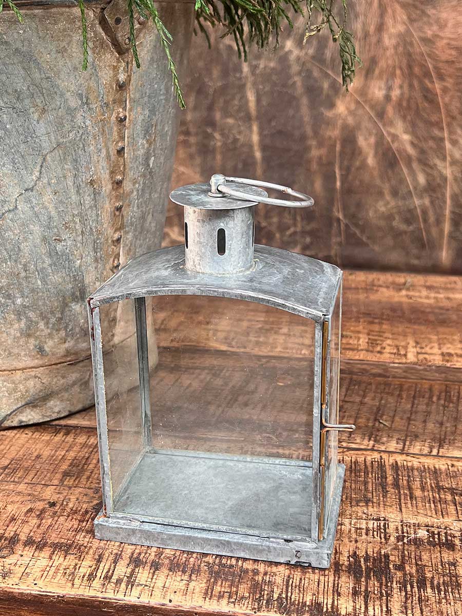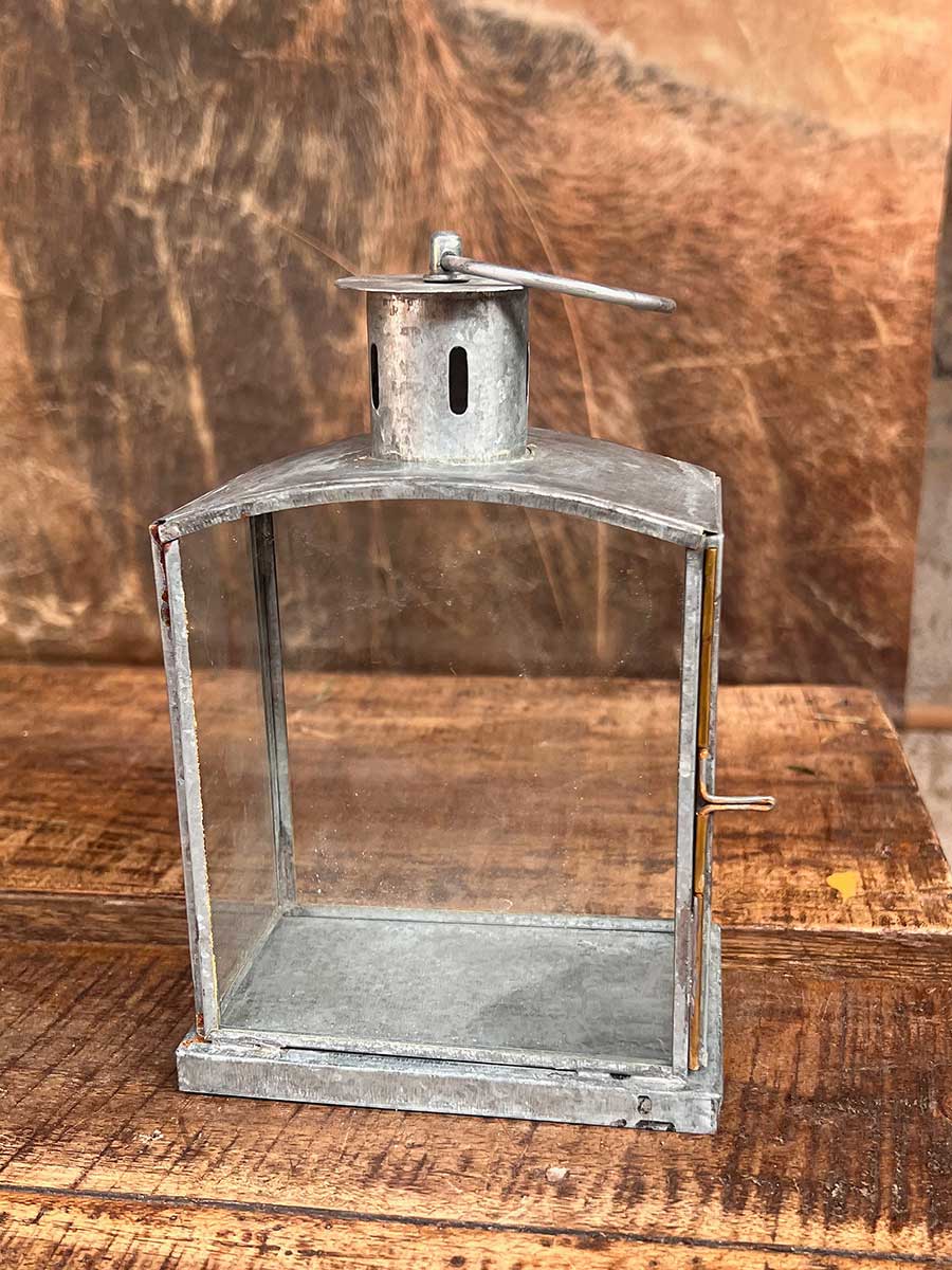 Shabby Vintage Zink Laterne mit Glasscheiben, Bügel und Tür. Die Laterne läßt sich wunderbar dekorieren durch die seitliche Tür.