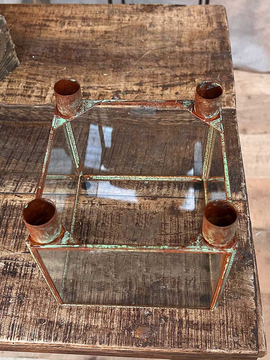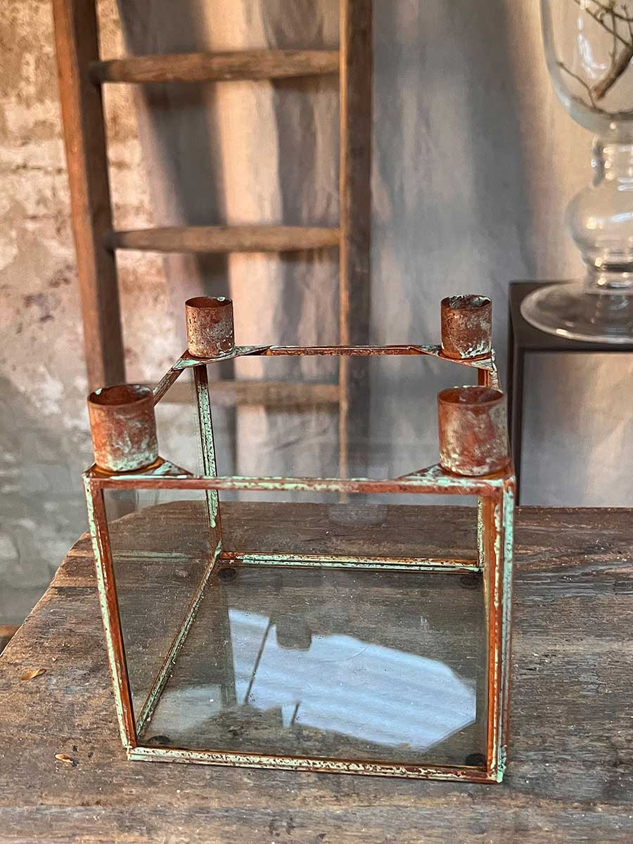 Shabby Vintage 4er Metallkerzenhalter Curie mit Glaswänden für haushaltsübliche Stabkerzen, tolles Landhausdesign.