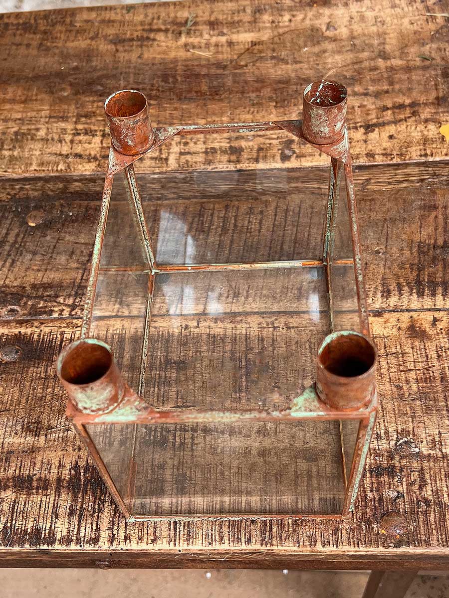 Shabby Vintage 4er Metallkerzenhalter Curie mit Glaswänden für haushaltsübliche Stabkerzen, tolles Landhausdesign.