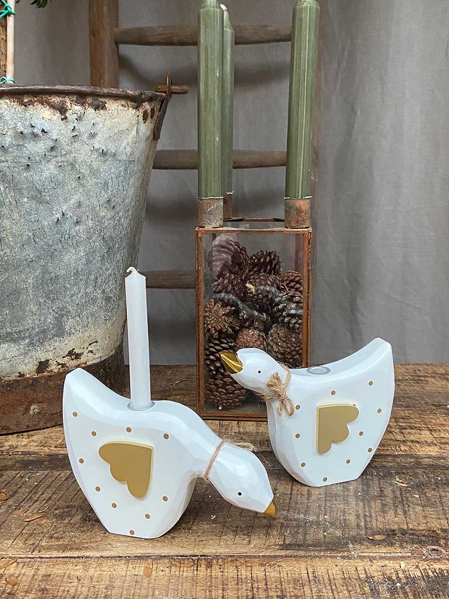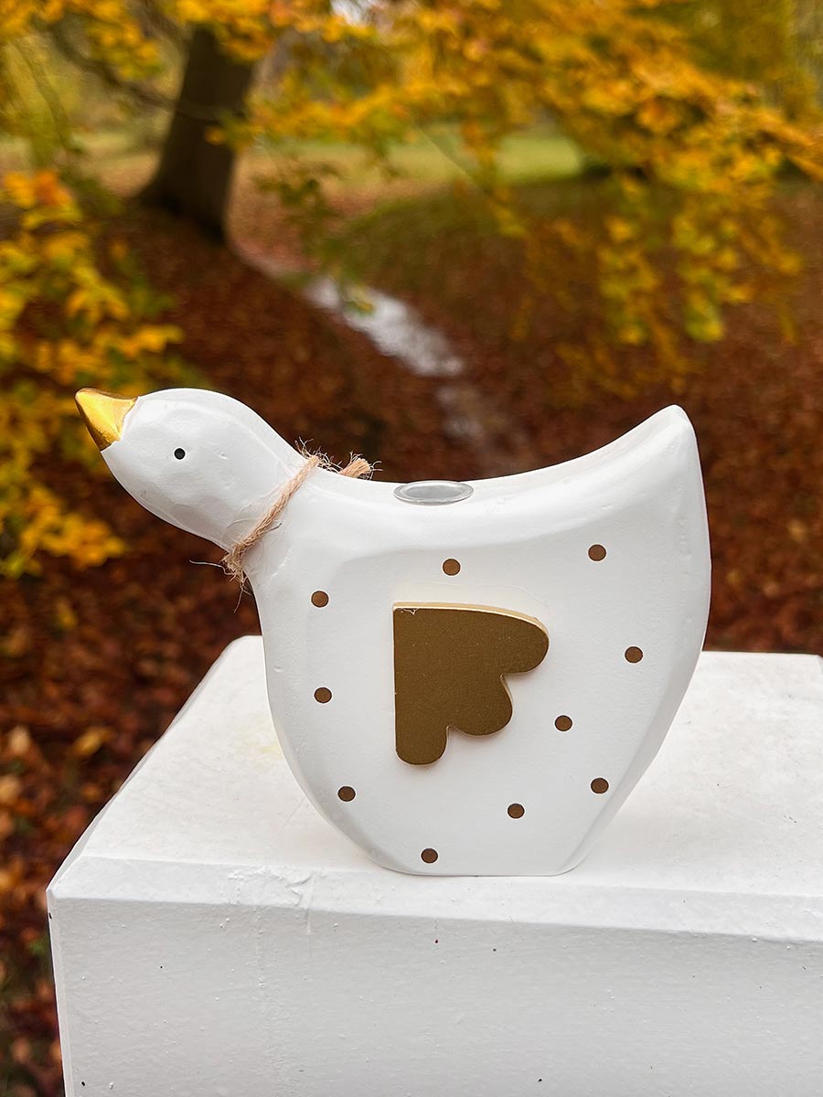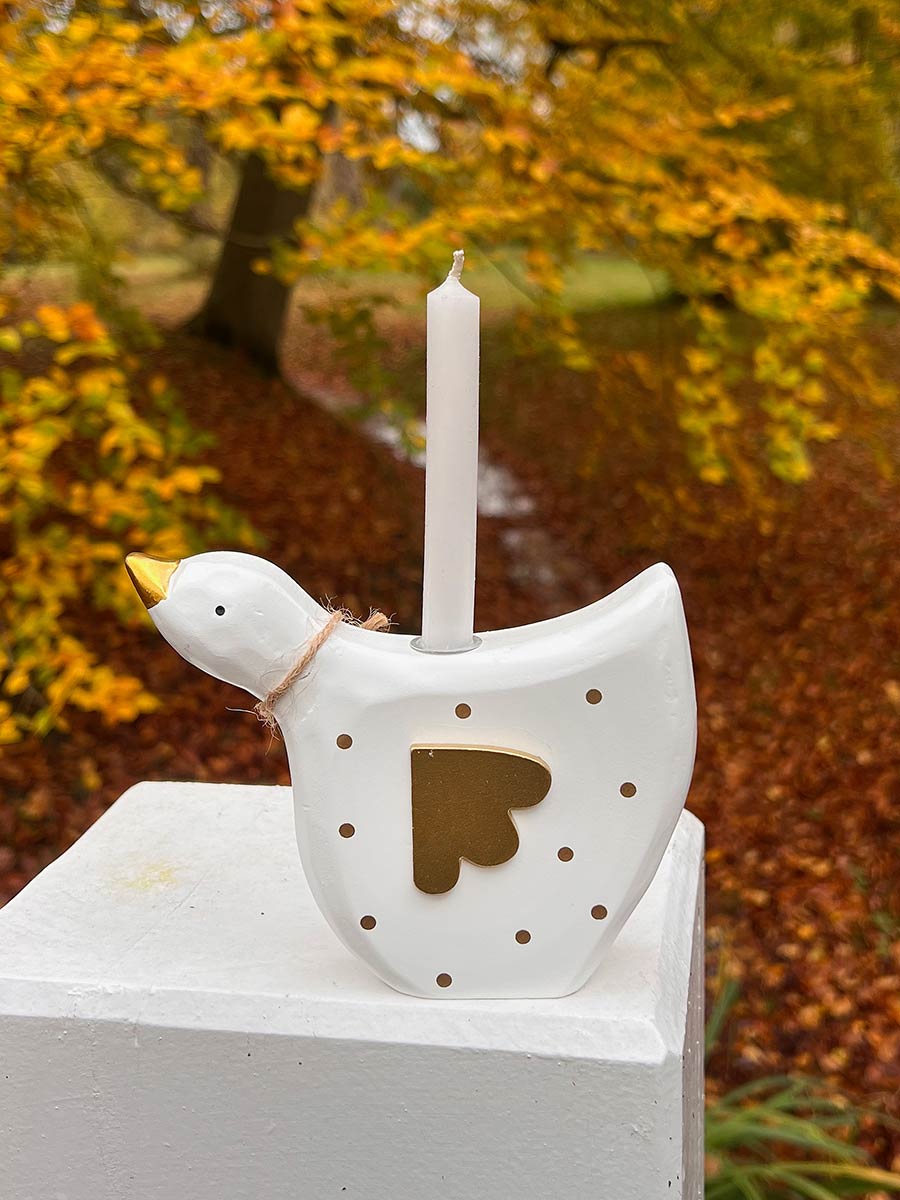 Weiße Holzgans Kerzenhalter weiß mit goldenen Punkten Kopf hoch Madleys H11