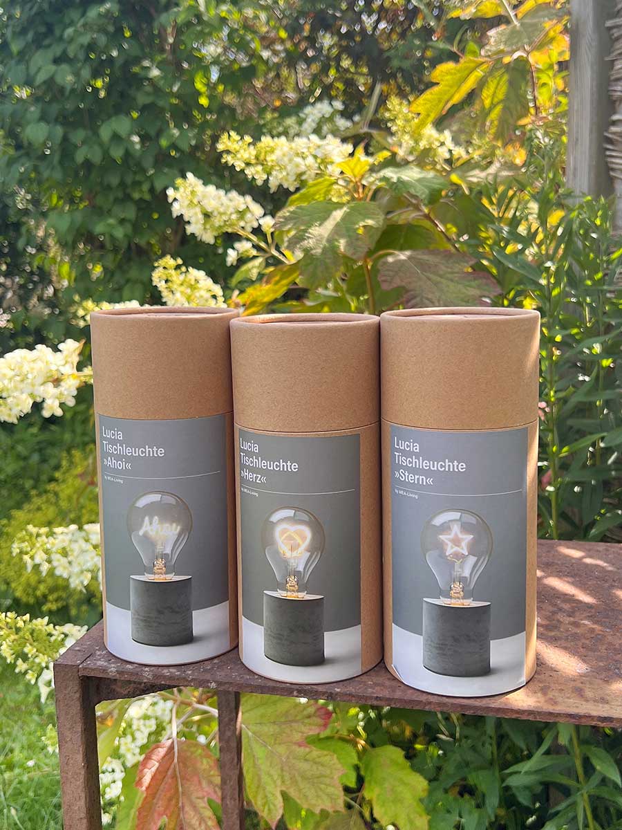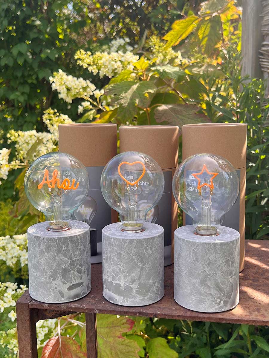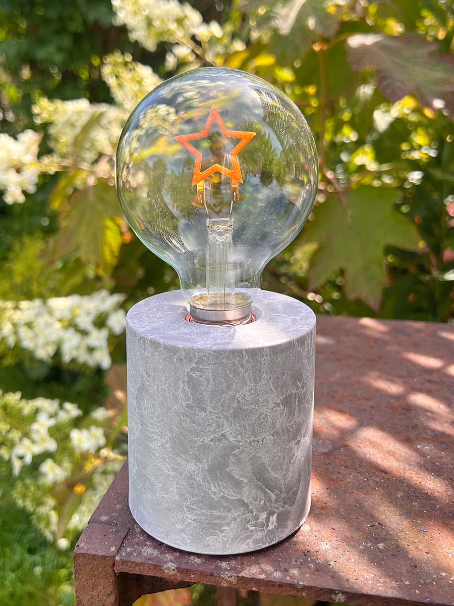 Stimmungsvolle LED-Tischleuchte Stern warmweiss mit 6 Stunden Timerfunktion inklusive Leuchtmittel - ein außergewöhnliches Beleuchtungsobjekt mit Sockel in Betonoptik. Auf der Unterseite befindet sich ein Batteriefach.