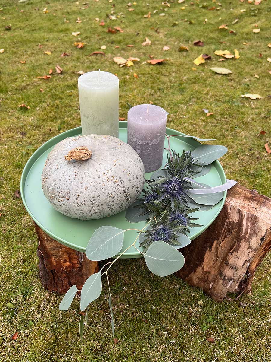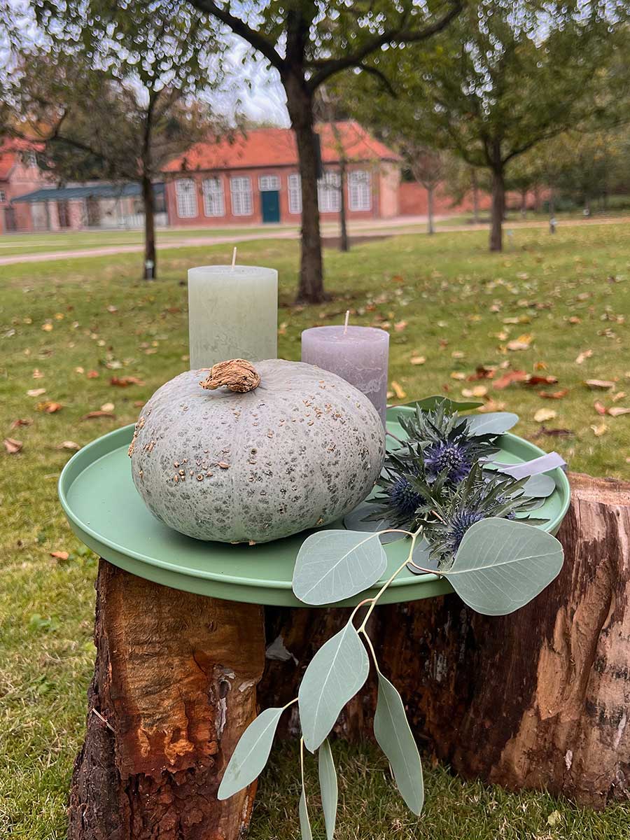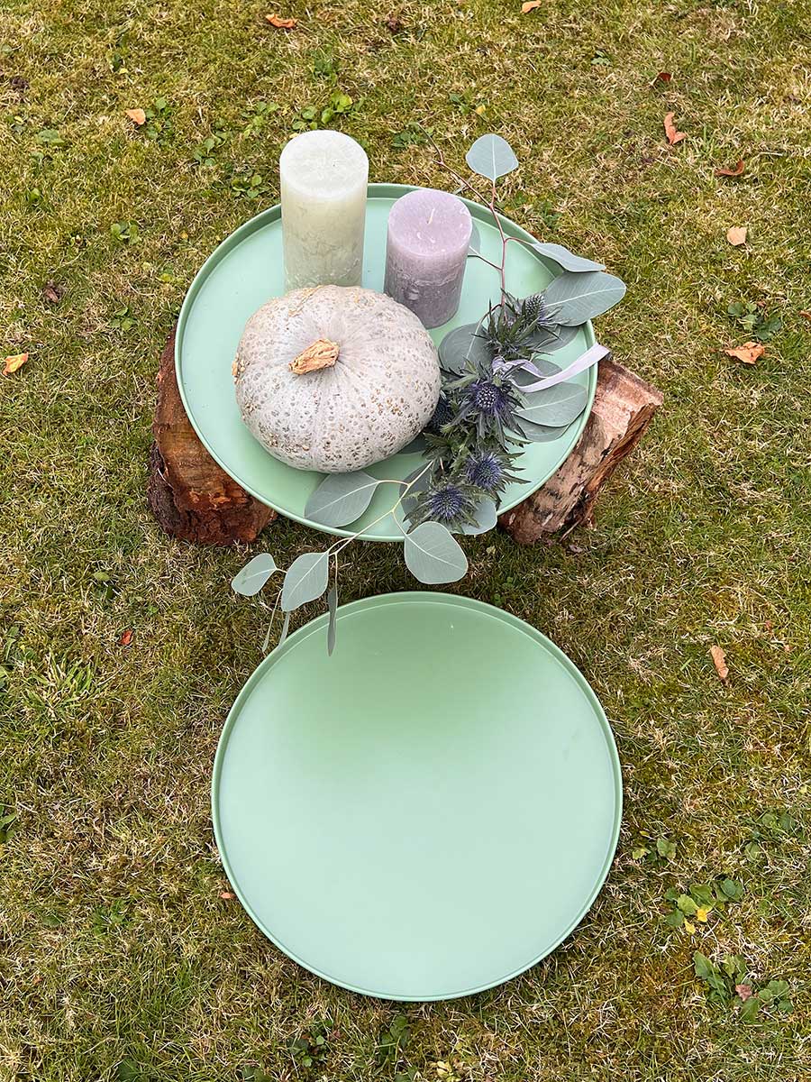 Das runde Metalltablett in salbei grün bietet unzähliche Einsatzmöglichkeiten. Es eignet sich prima als Unterteller für große florale Werkstücke wie Kränze und Gestecke oder für individuelle Tisch-Dekorationen mit Kerzen, Zweigen, Früchten, Zapfen und Figuren. Lasst Eurer Fantasie freien Lauf.