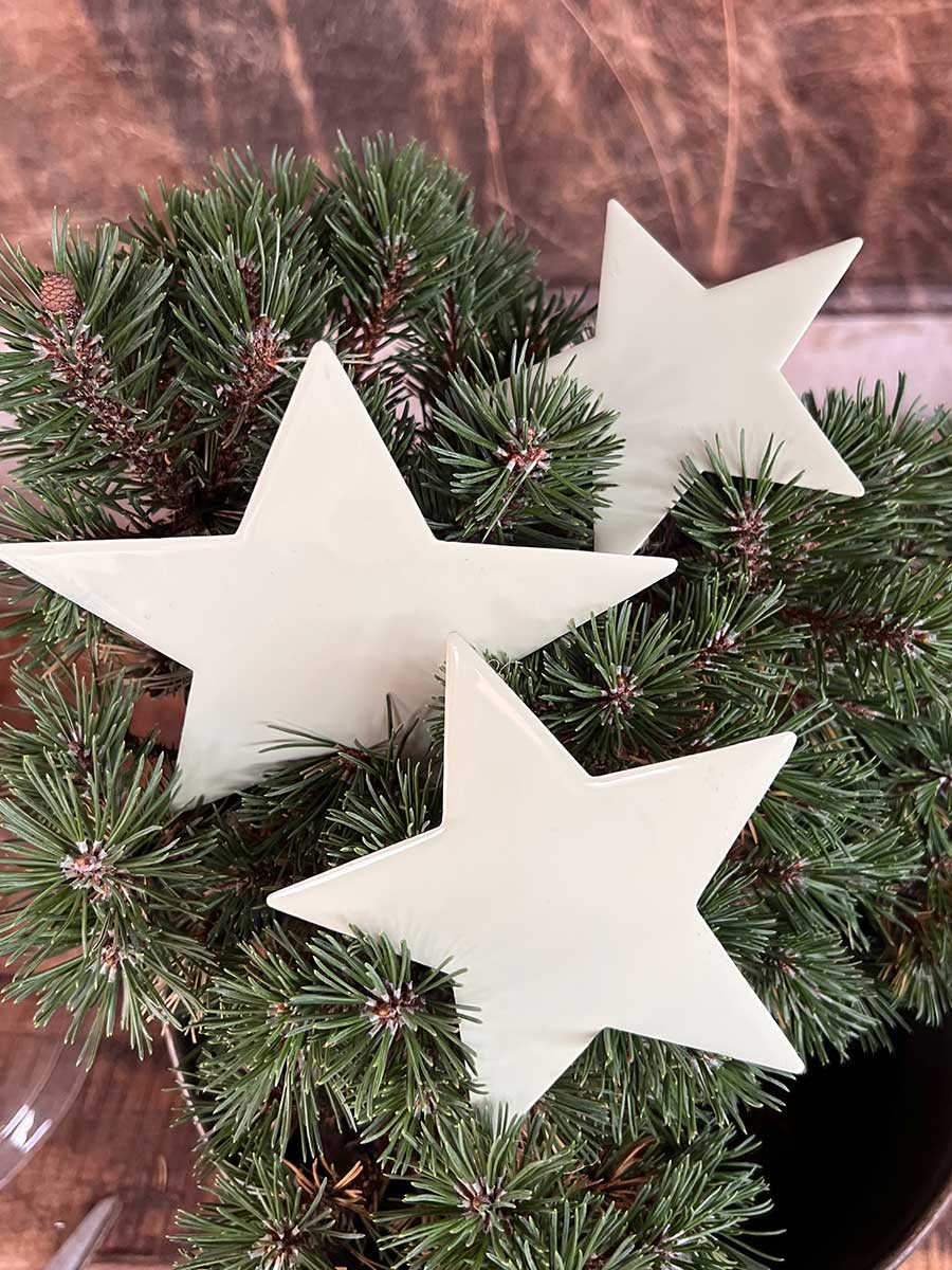 Stimmungsvoller flacher Metallstern in weiss lackiert - ein zauberhaftes Dekorationselement zum Aufhängen und verschönern von Pflanzschalen - nicht nur für die Herbst-und Weihnachtszeit geeignet.