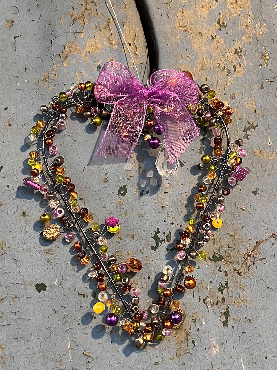 Dieses hübsche kleine Perlenherz von Bell'Arte mit Perlen, Pailletten in lila grün Kupfer und Tropfenkristall in der Mitte bringt ein zauberhaftes Funkeln in die Wohnung. Ein eleganter Hingucker für Fenster, Türen und Wände. Mit Drahtschlinge zum Aufhängen. Alle Perlenkränze werden in Handarbeit gefertigt, daher kann es zu kleinen Abweichungen in Form und Ausführung kommen.
