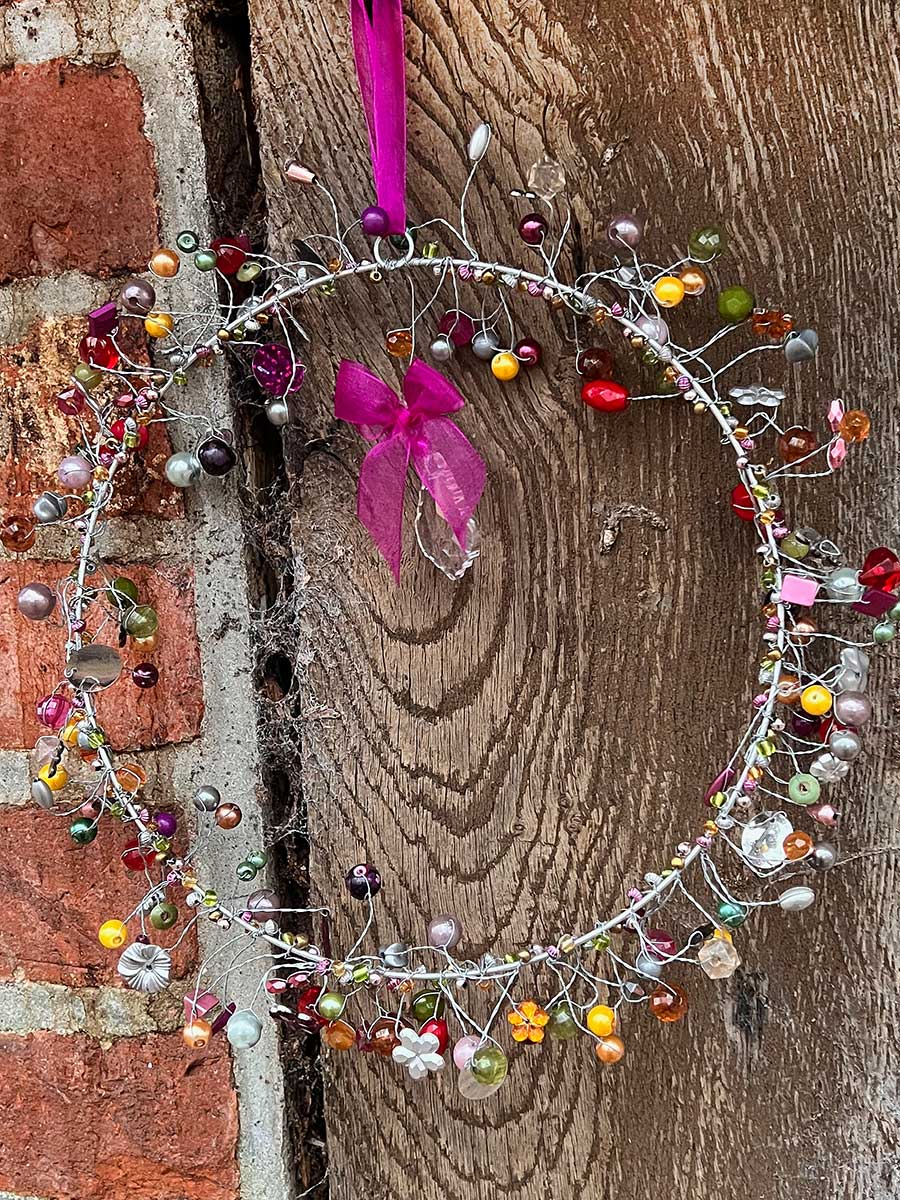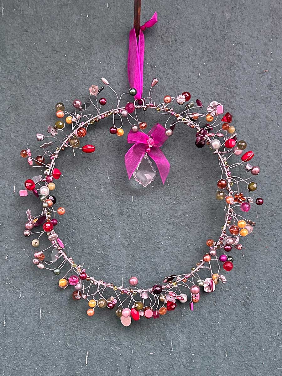 Dieser hübsche Perlenring von Bell'Arte mit aubergine und silberfarbenen Perlen / Pailletten und Kristall in der Mitte bringt ein zauberhaftes Funkeln in die Wohnung. Ein eleganter Hingucker für Fenster, Türen und Wände. Mit Bändchen zum Aufhängen. Alle Perlenkränze werden in Handarbeit gefertigt, daher kann es zu kleinen Abweichungen in Form und Ausführung kommen.